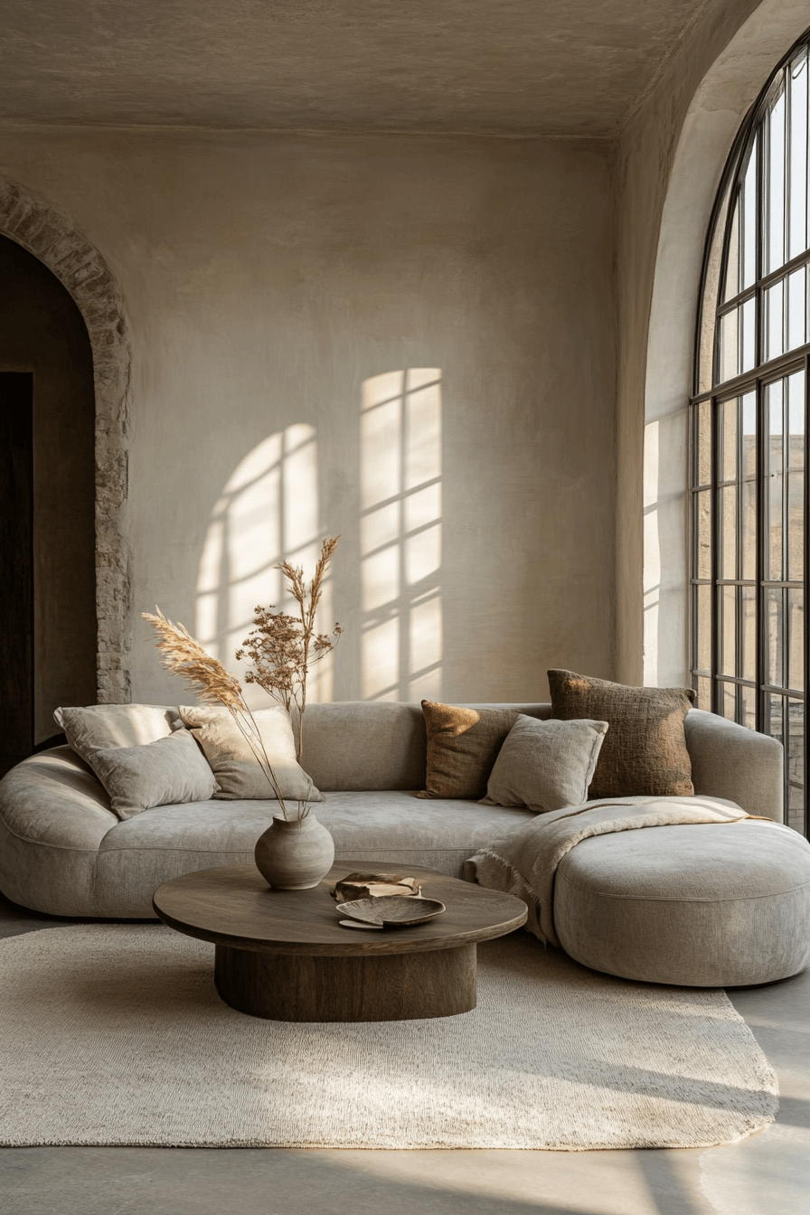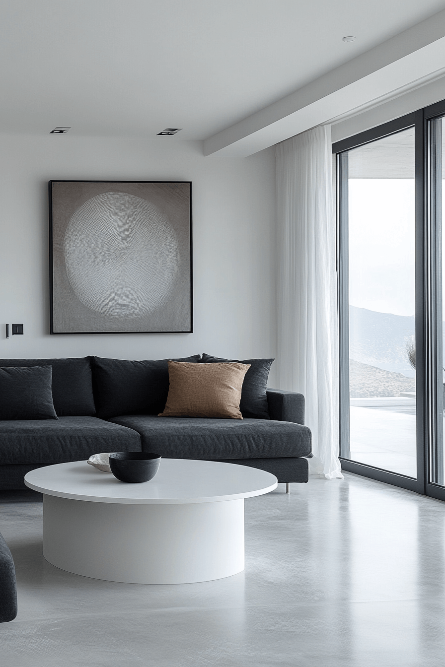 Soft curves balance the strong silhouette of a dark grey sofa living room beautifully. Rounded tables and plush chairs introduce inviting flow. Neutral tones soften the palette. Organic shapes enhance comfort and harmony. The space feels stylish yet relaxed. Add curved elements and transform your living room effortlessly now.