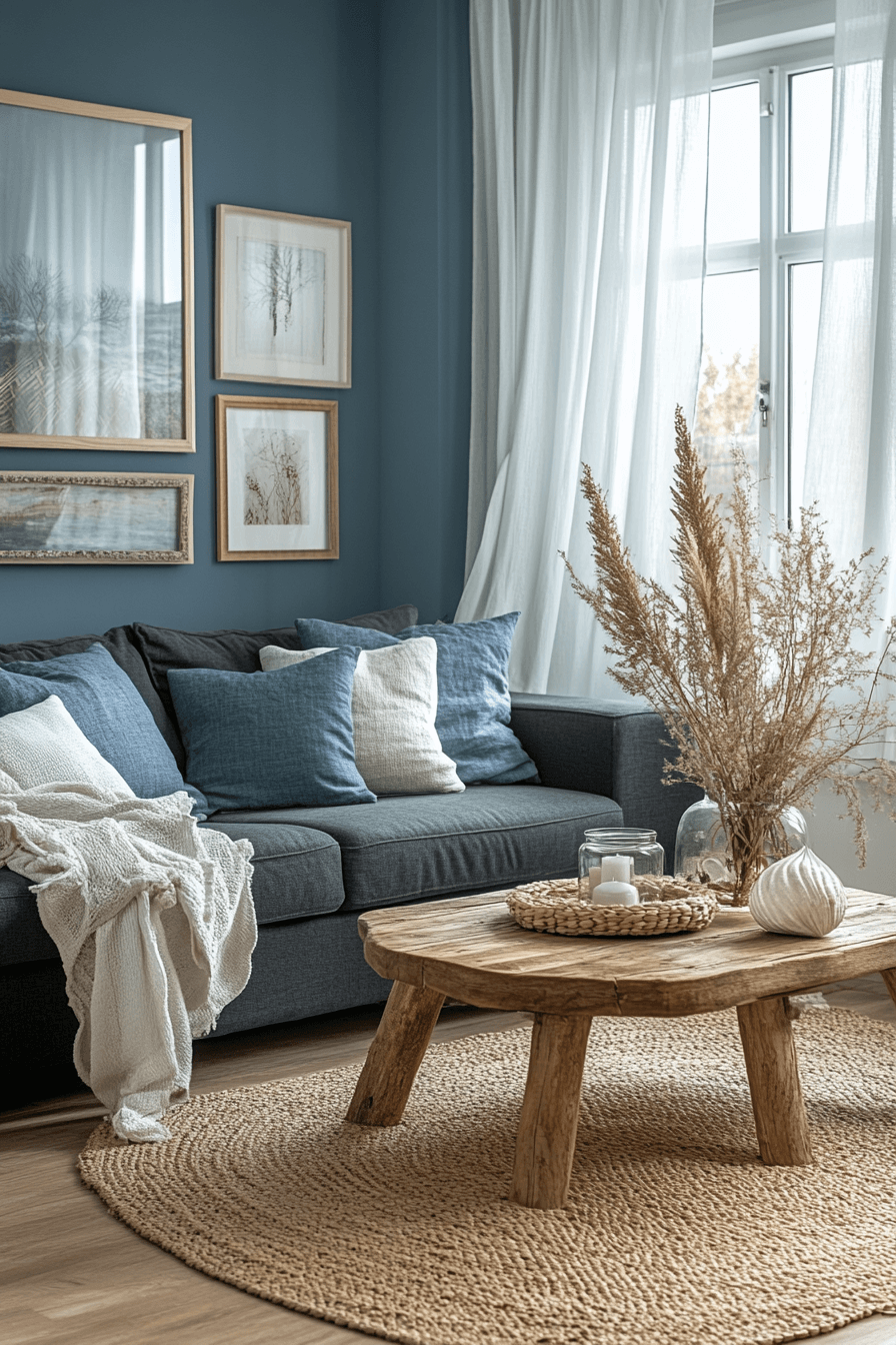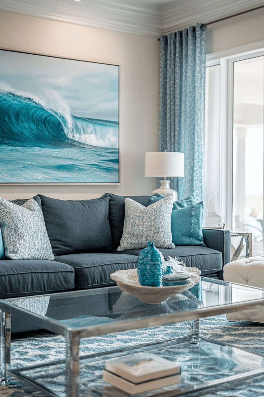 Ocean-inspired hues bring calm depth to a dark grey sofa living room. Deep blues and seafoam accents pair seamlessly with charcoal upholstery. Natural fibers introduce breezy texture. Clean lines maintain contemporary appeal. The atmosphere feels refreshing and balanced. Dive into coastal elegance and transform your living room today.
