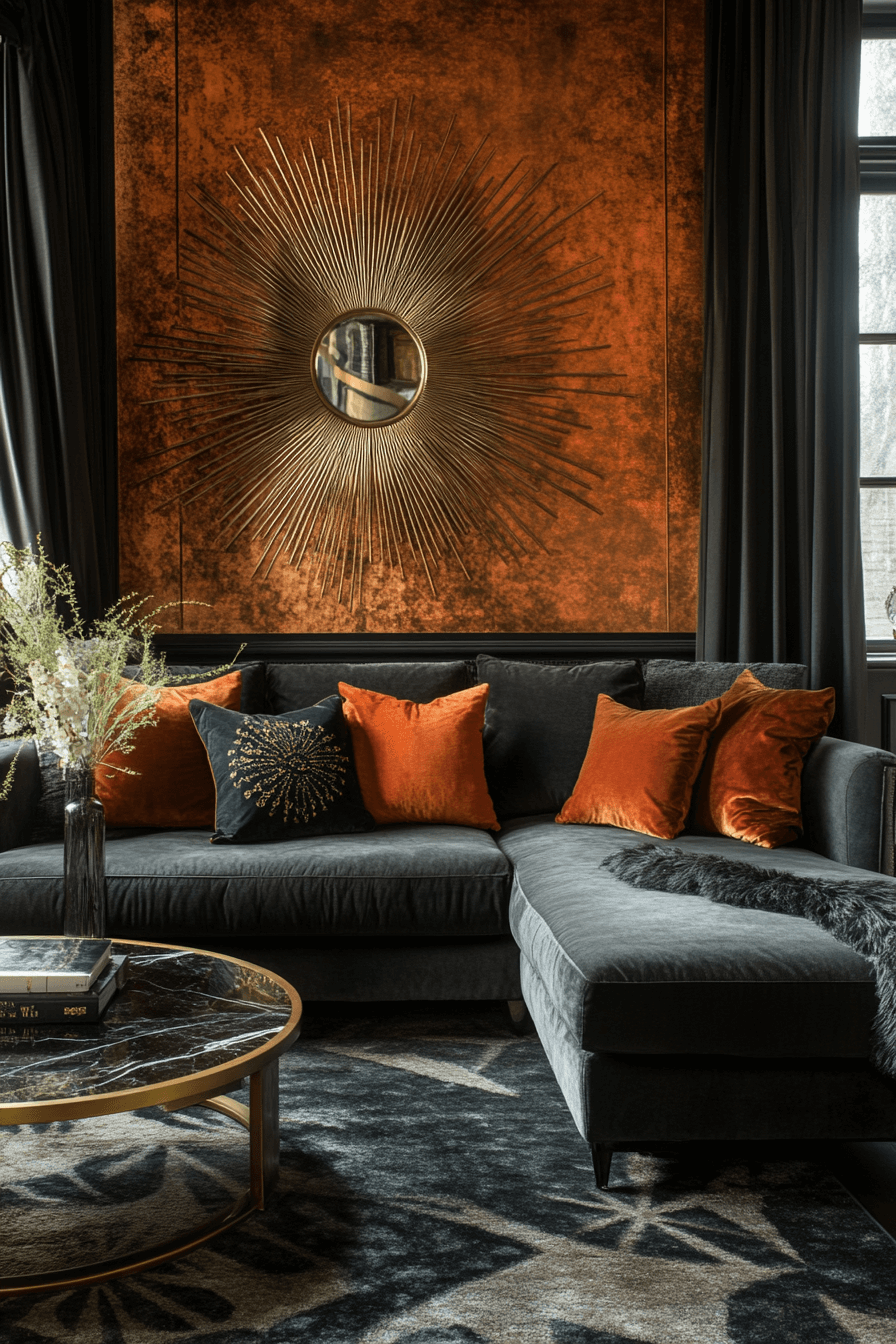 Art Deco glamour elevates a dark grey sofa living room with timeless drama. Gold accents and geometric motifs contrast beautifully with the deep upholstery. Structured silhouettes add vintage sophistication. Mirrored finishes amplify light and richness. The space feels bold and luxurious. Channel Deco-inspired elegance and create a showstopping living room today.