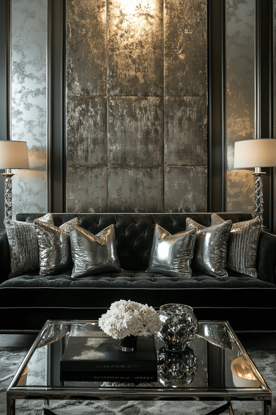 Chrome and brushed silver accents refine a dark grey sofa living room effortlessly. Metallic details reflect against the matte upholstery. The subtle shine introduces depth without distraction. Balanced lighting enhances polish and warmth. The result feels sleek and contemporary. Add metallic sophistication and elevate your decor today.