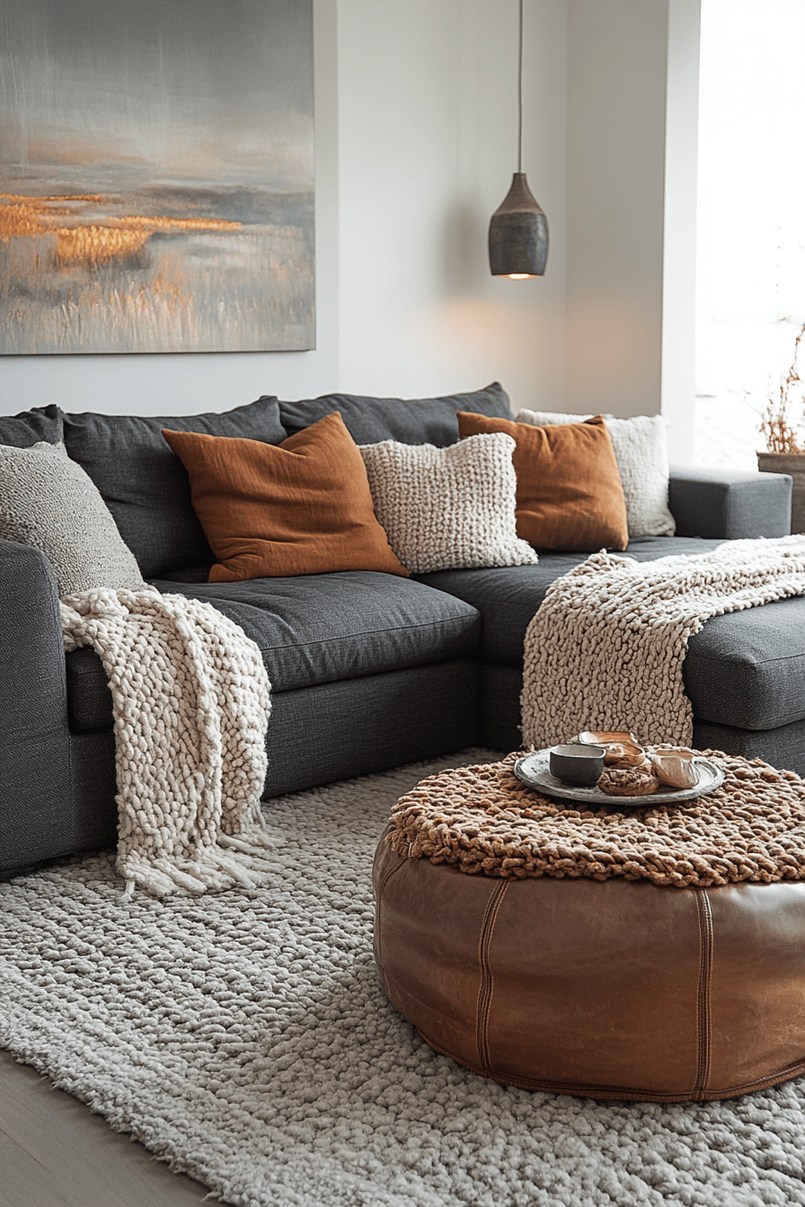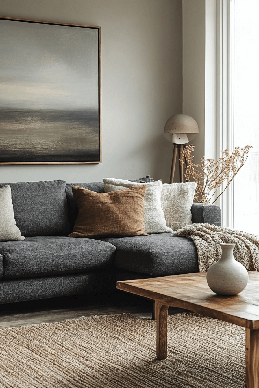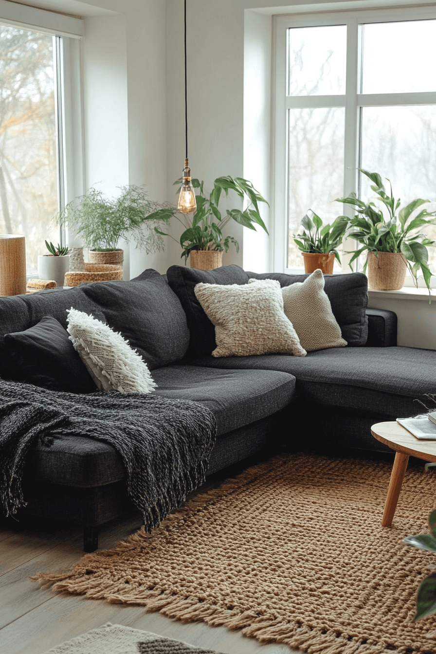 Texture layering adds richness to a dark grey sofa living room without overwhelming the palette. Knit throws and woven rugs introduce tactile interest. The deep grey sofa anchors each material seamlessly. Cohesive tones maintain harmony. The space feels warm and inviting. Explore the beauty of texture and elevate your living room today.