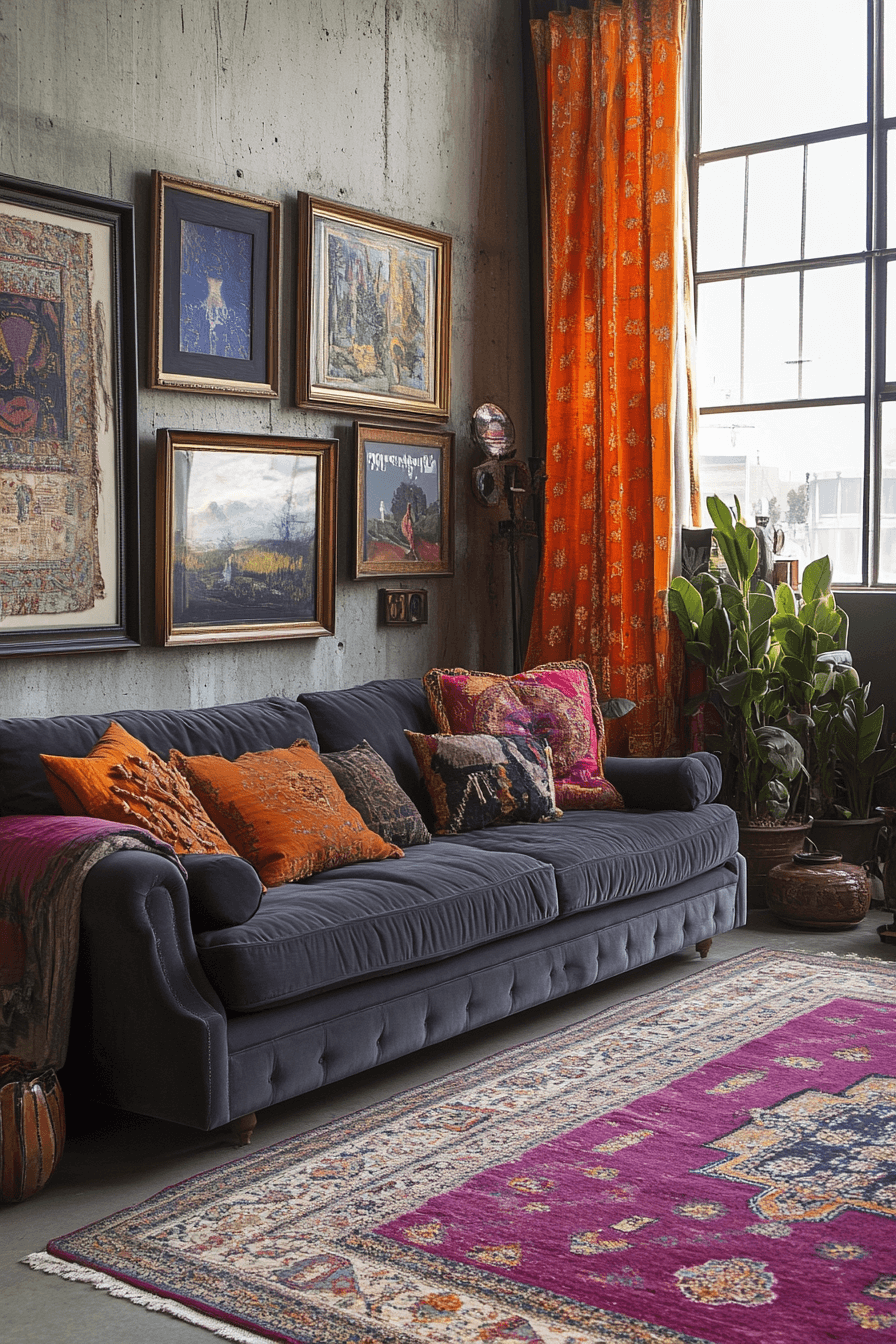 An eclectic approach brings playful personality to a dark grey sofa living room. The neutral sofa provides a foundation for mixing patterns and eras. Vintage decor pairs effortlessly with modern pieces. Layered accessories create storytelling charm. The room feels expressive yet balanced. Celebrate creative freedom and design your perfect space now.