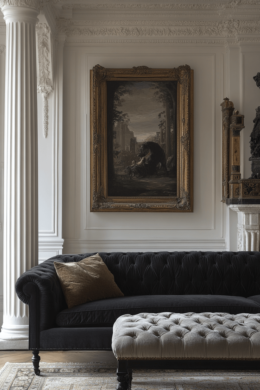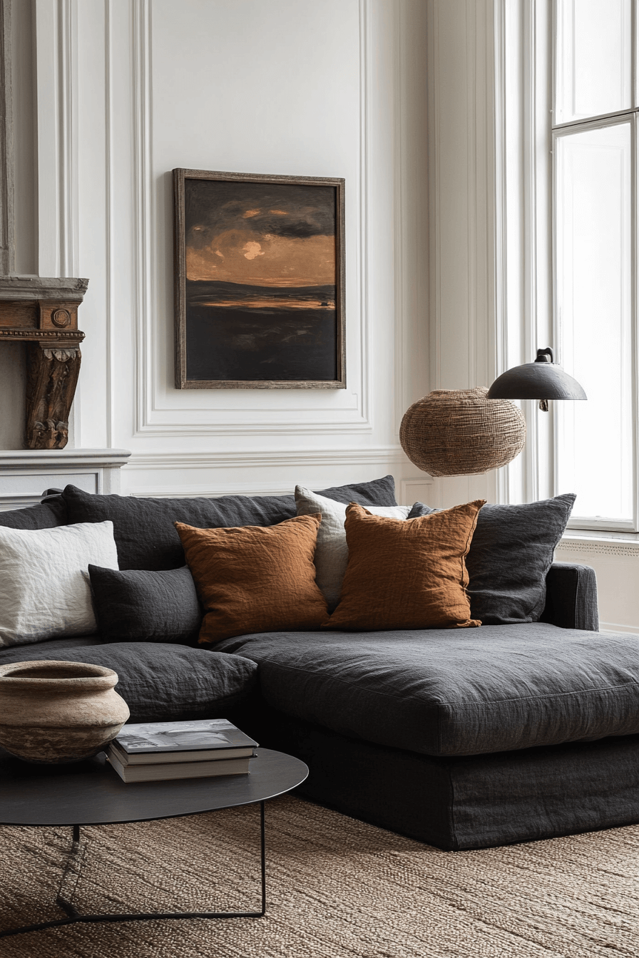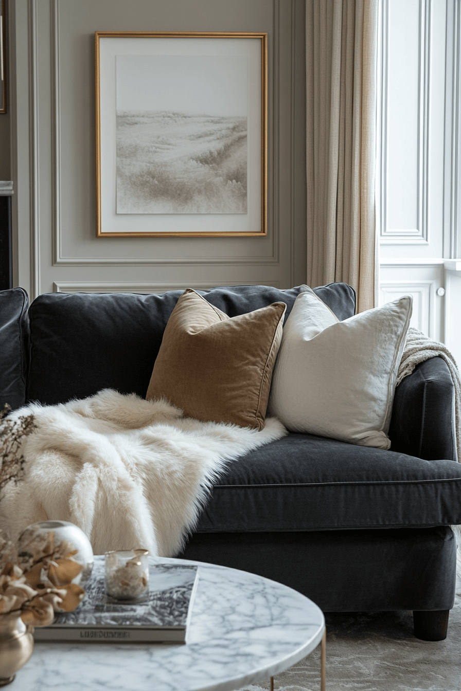 Classic architectural details blend beautifully within a dark grey sofa living room influenced by neo-classical design. Crown moldings and paneled walls complement the deep upholstery. Refined fabrics add softness and elegance. Subtle gilded accents enhance sophistication. The balance feels timeless yet modern. Reimagine traditional charm and elevate your living room today.