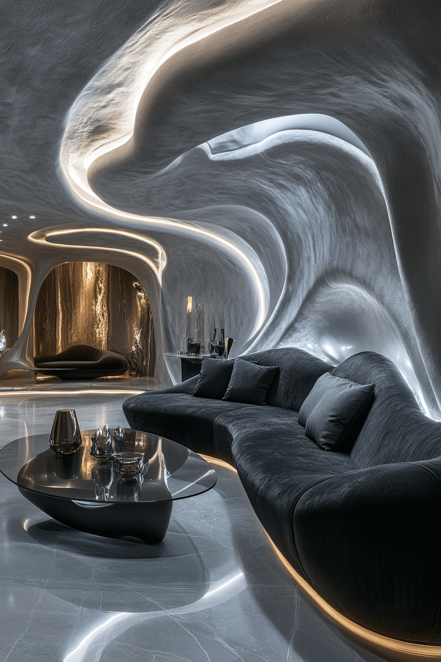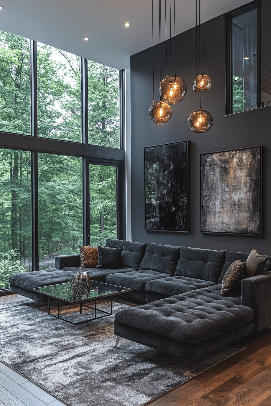 Sleek lighting solutions bring futuristic energy into a dark grey sofa living room. The deep upholstery grounds luminous finishes and chrome details. High-gloss accents reflect light beautifully. Smart lighting enhances mood shifts throughout the day. The space feels forward-thinking and refined. Upgrade your living room with a modern edge today.
