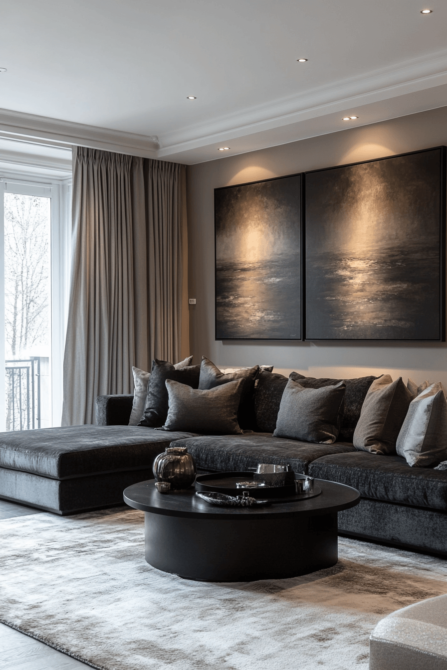 Contemporary refinement transforms a dark grey sofa living room into a statement of quiet luxury. Light rugs and layered drapery soften the bold base. Sculptural tables add artistic contrast. Metallic accents provide subtle shimmer. The room feels curated and effortlessly elegant. Discover how modern polish can redefine your living room today.