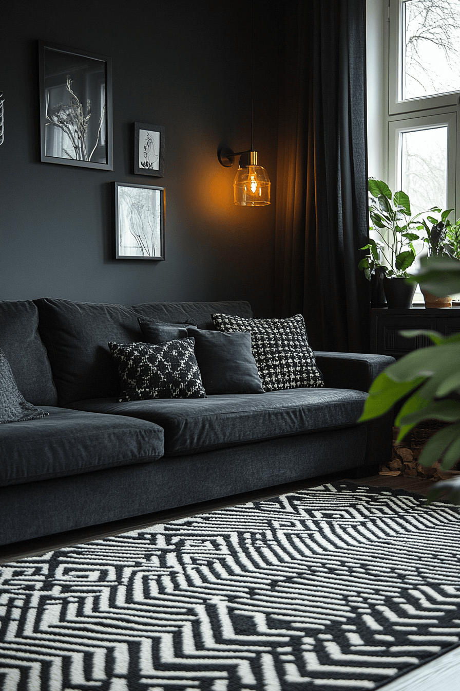 Graphic contrast energizes a dark grey sofa living room with sharp definition. White backdrops and black accents frame the deep upholstery dramatically. Structured furniture enhances visual clarity. Strategic lighting highlights architectural lines. The room feels bold and contemporary. Embrace striking contrast and redefine your decor now.