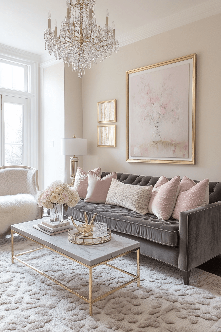 Soft blush hues introduce gentle sophistication into a dark grey sofa living room. Velvet accents add texture and warmth. Muted pastels balance the deeper tones without overpowering them. Subtle lighting enhances softness throughout the space. The atmosphere feels elegant and welcoming. Add soft glam touches and let your living room glow beautifully now.