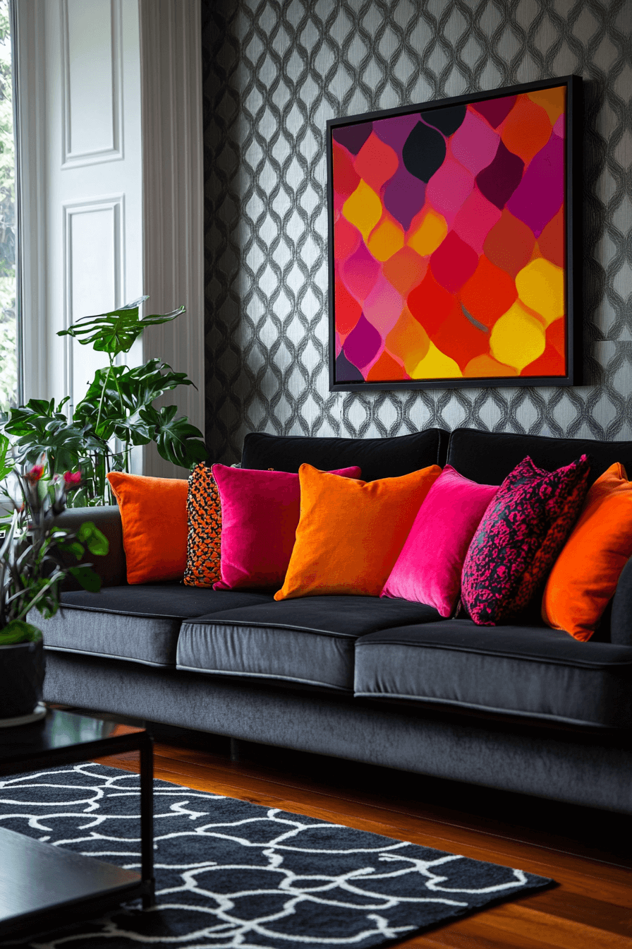 Bold patterns and saturated colors electrify a dark grey sofa living room instantly. Vibrant rugs and expressive art pop against the charcoal base. The strong contrast feels dynamic yet controlled. The sofa provides stability amid creative energy. The room becomes lively and unforgettable. Make a fearless design move and transform your space today.
