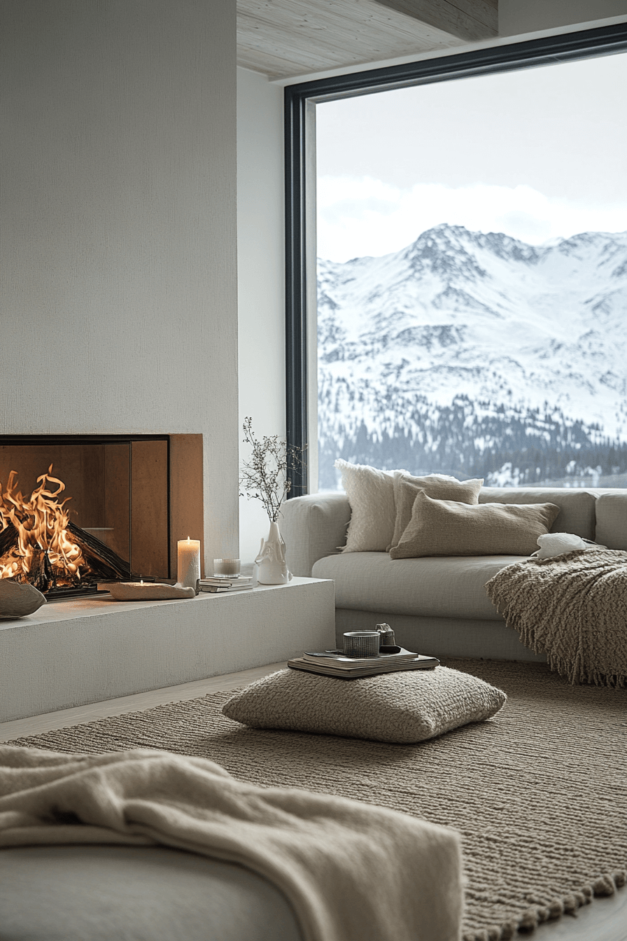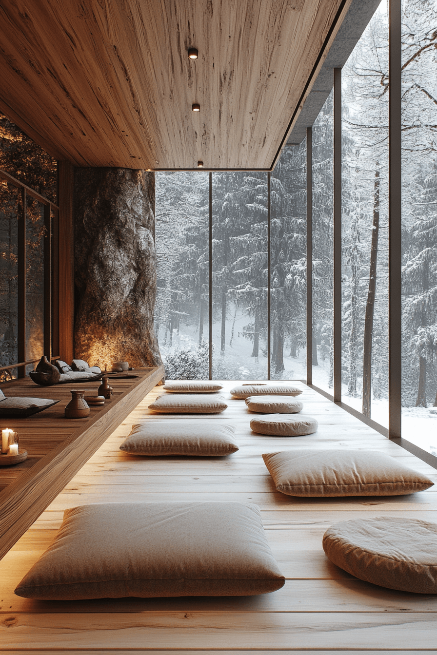 Crafted for mindfulness, this meditation space channels alpine interior design through simplicity and connection to nature. Low seating, natural textiles, and earthy hues foster quiet reflection. Snow-dusted vistas beyond the window amplify serenity. Gentle lighting softens every edge of the room. The environment feels grounding and restorative. Create your own alpine interior design sanctuary and embrace stillness now!