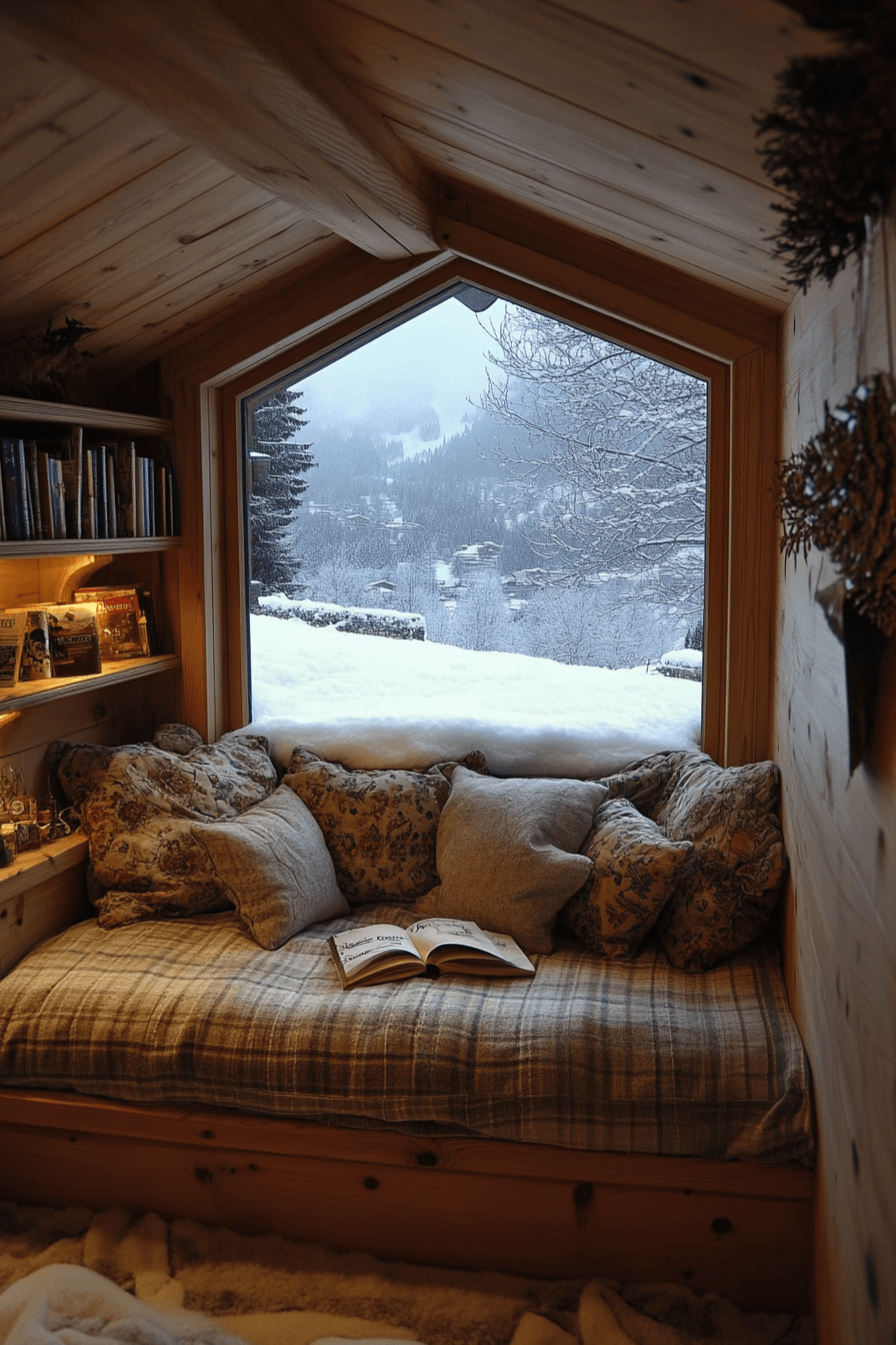 Small in scale but rich in comfort, this window reading nook embodies alpine interior design charm. A cushioned bench layered with textured blankets invites cozy mornings. Timber framing and ambient lighting create intimate warmth. The mountain view beyond completes the escape. It’s cheerful, peaceful, and irresistibly snug. Discover alpine interior design nook ideas and carve out your own cozy corner today!