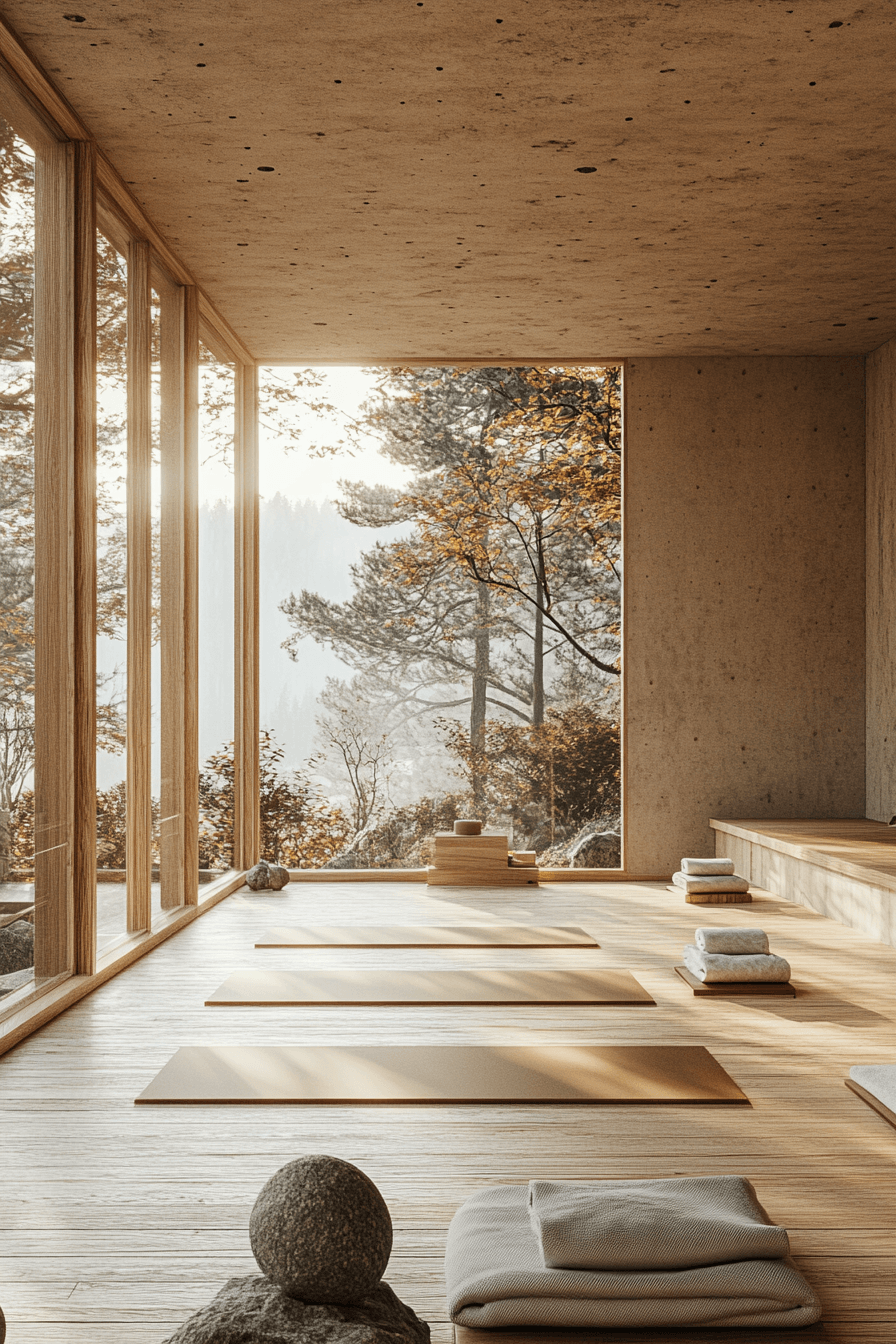 This luminous yoga studio expresses alpine interior design through natural light and open flow. Sweeping windows frame pine forests and snowy ridgelines. Warm wooden floors ground each movement with organic elegance. Minimal decor maintains focus and clarity. The energy feels balanced and rejuvenating. Invite alpine interior design into your wellness practice and design your personal retreat now!