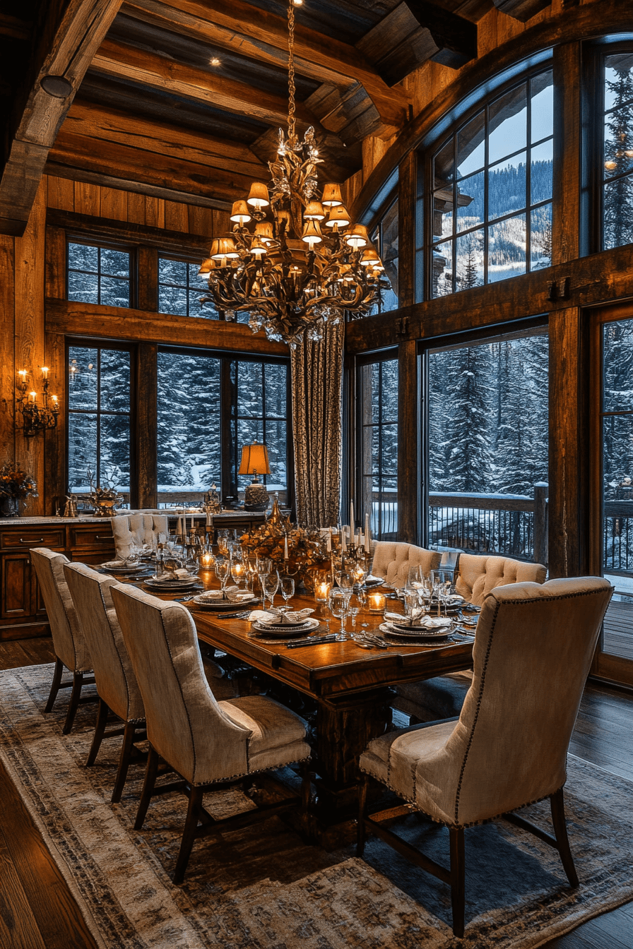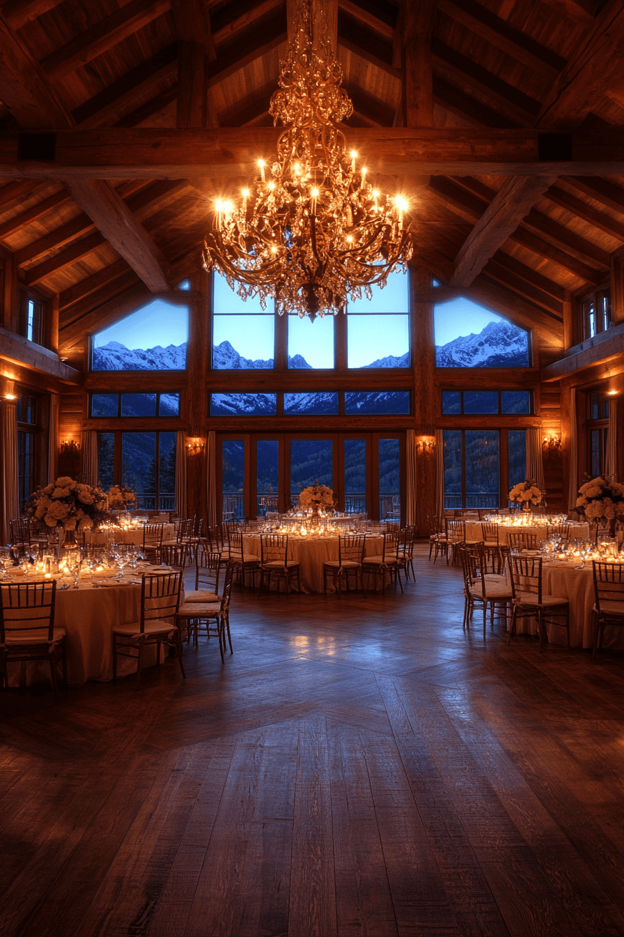 Dramatic yet inviting, this grand mountain hall reimagines alpine interior design for celebratory spaces. Soaring timber beams create breathtaking architectural scale. Luxurious lighting fixtures shimmer against rustic backdrops. Rich textures layer beautifully while staying rooted in natural authenticity. The ambiance feels vibrant and unforgettable. Incorporate alpine interior design into your event venue and elevate every occasion today!