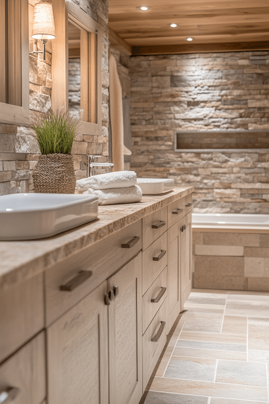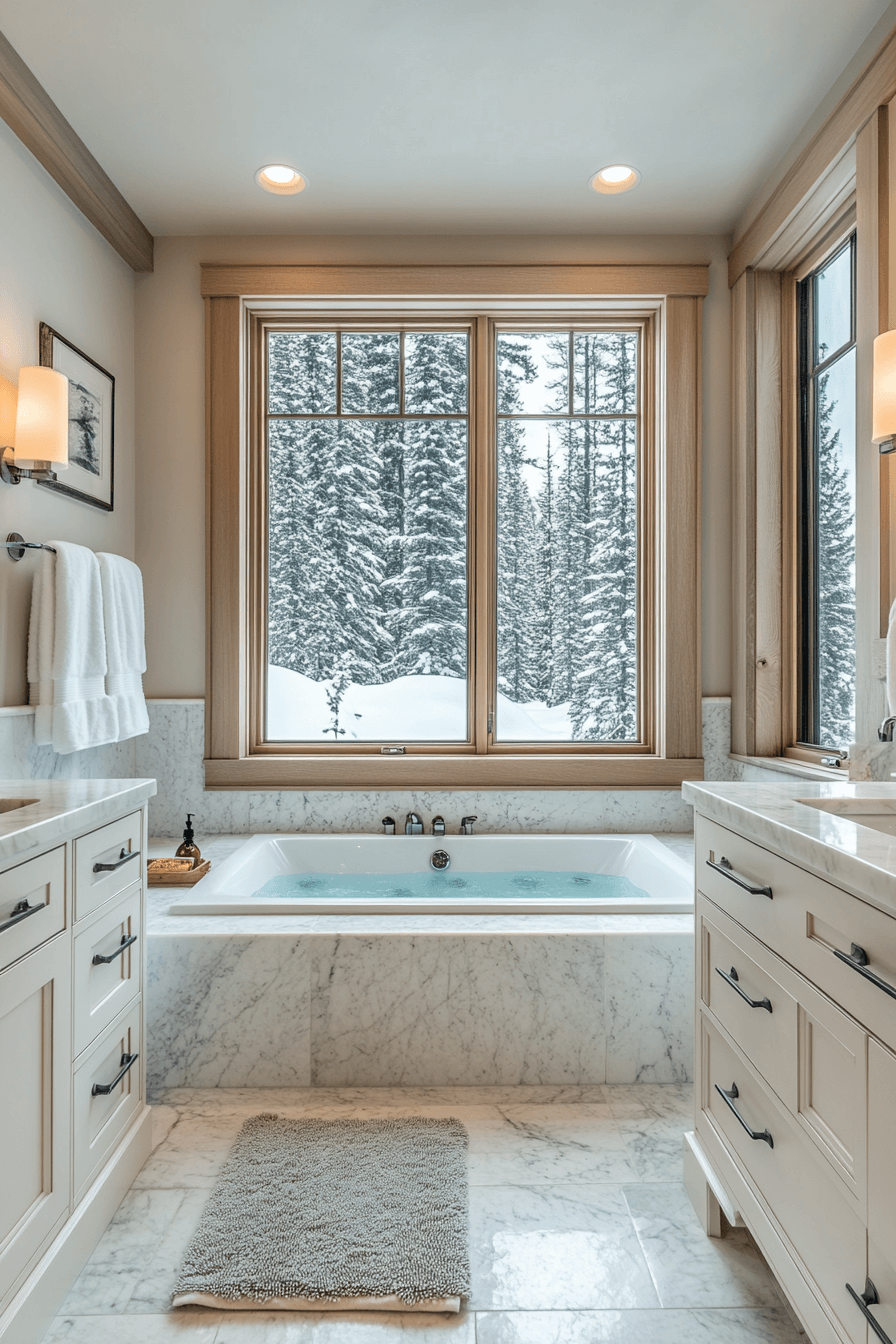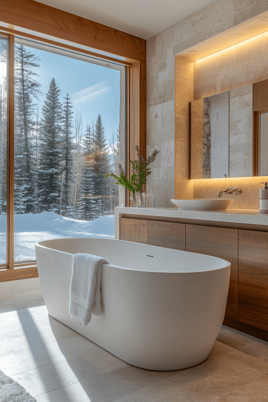 Nature-infused indulgence defines this luxurious spa bathroom inspired by alpine interior design. A deep soaking tub, heated stone floors, and expansive windows create ultimate relaxation. Wood and marble finishes provide grounding contrast. Plush textiles soften the modern framework. Every detail whispers mountain elegance. Refresh your bathroom with alpine interior design luxury and unwind in style now!