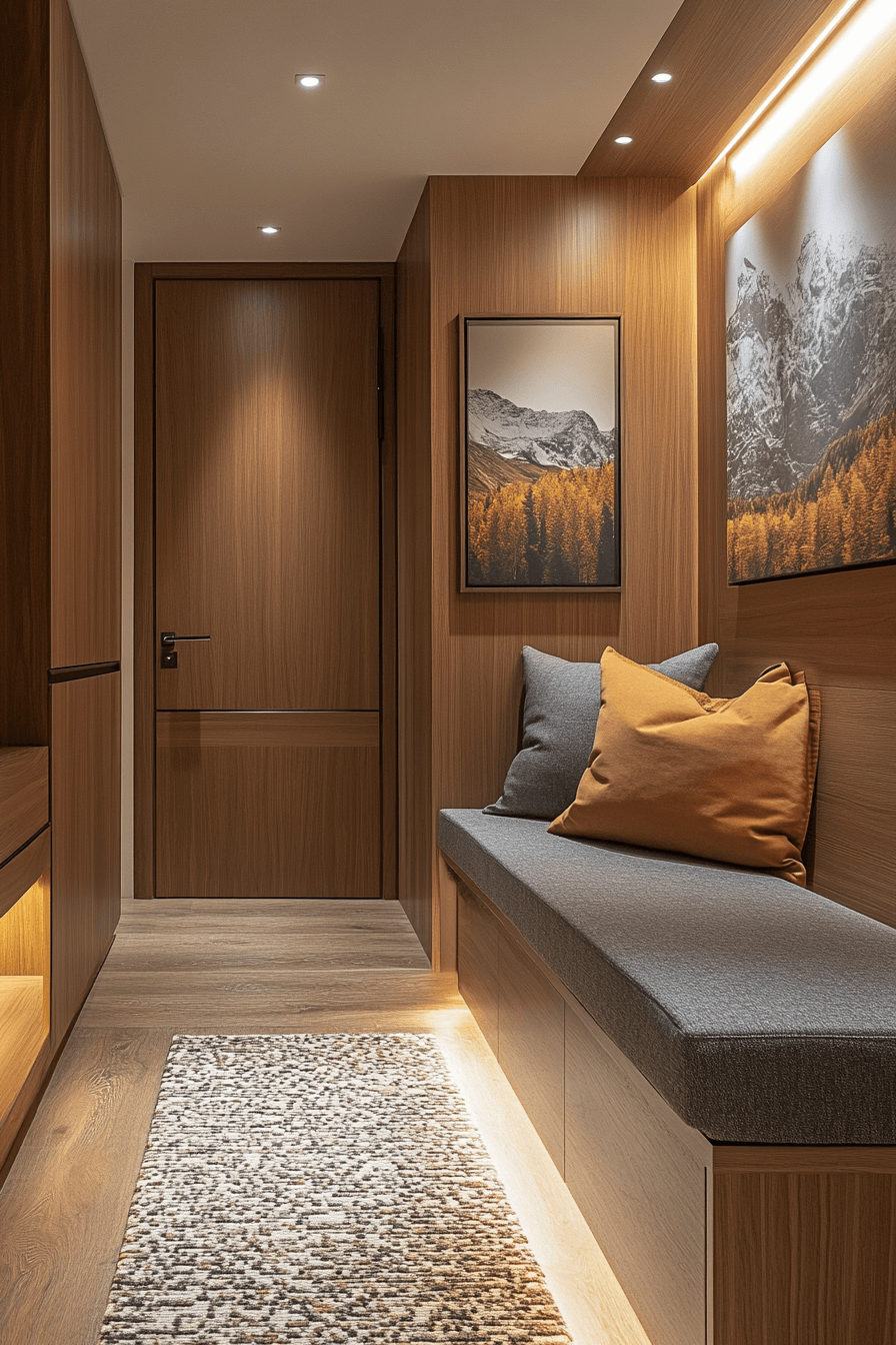 Sleek craftsmanship defines this transitional hallway shaped by alpine interior design. Custom cabinetry blends seamlessly into architectural lines. Carefully placed lighting enhances wood grain and texture. Neutral hues keep the passage bright and cohesive. The look feels subtle yet elevated. Transform overlooked spaces with alpine interior design inspiration now!