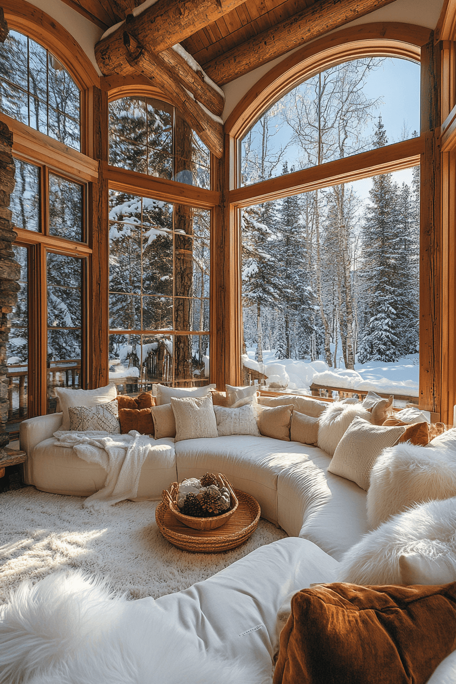 Radiant and uplifting, this sun-drenched conservatory highlights alpine interior design beauty. Glass walls reveal snowy landscapes while exposed beams add structure. Neutral furnishings let nature shine. A petite stove adds warmth against winter scenes. The mood feels bright and harmonious. Invite alpine interior design into your sunroom and celebrate every season now!