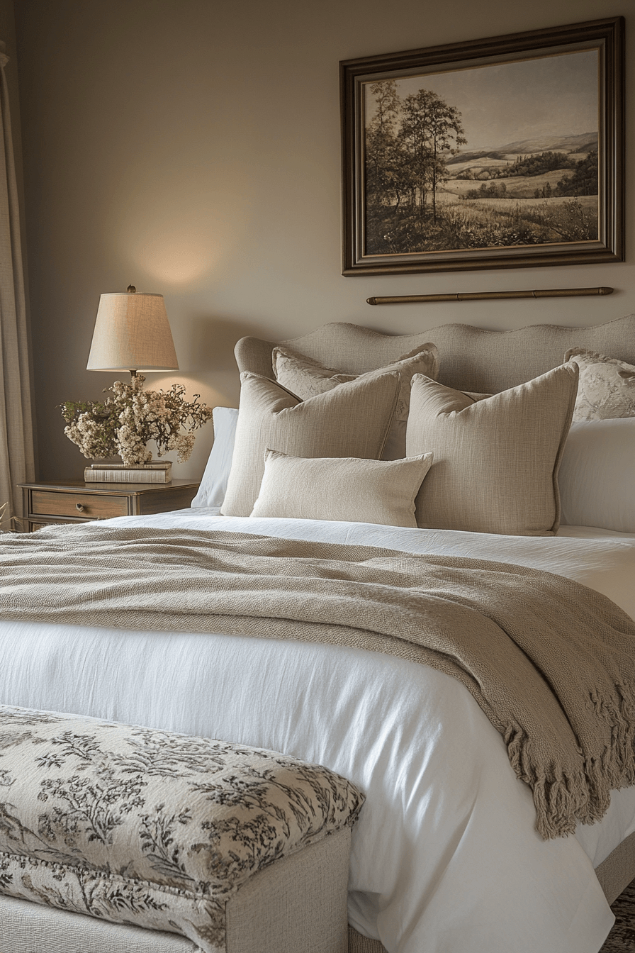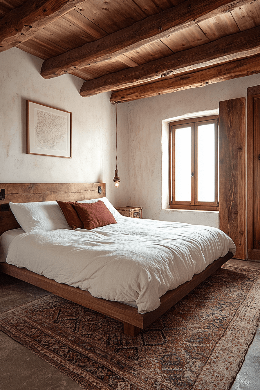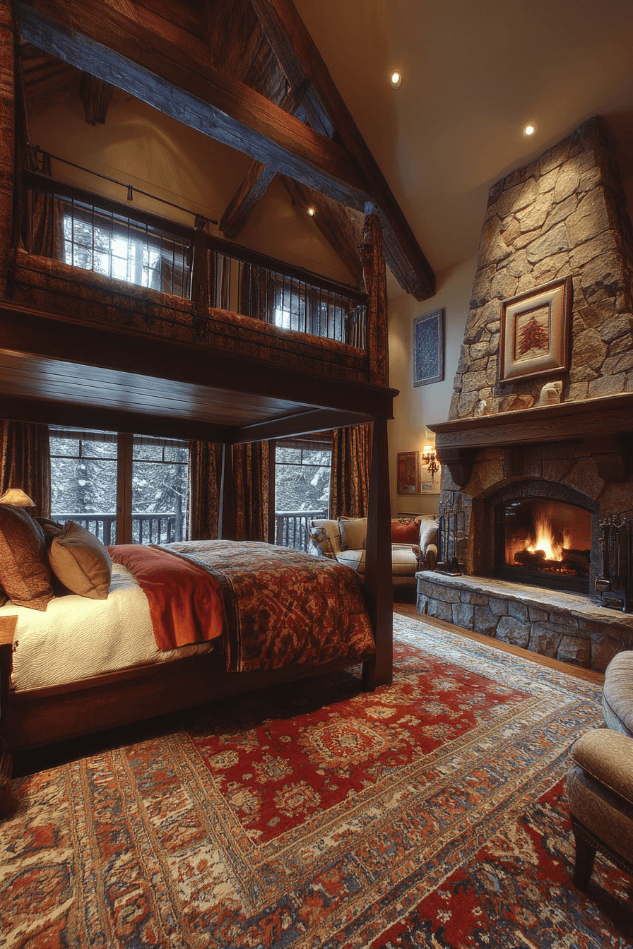 Serenity meets structure in this refined bedroom shaped by alpine interior design principles. Exposed rafters draw the eye upward while layered linens and plush textiles create enveloping comfort. Muted earth tones echo the landscape beyond the windows. Gentle ambient lighting enhances the cozy yet polished aesthetic. The result feels peaceful, sophisticated, and deeply restorative. Bring alpine interior design into your sleep sanctuary and refresh your retreat now!