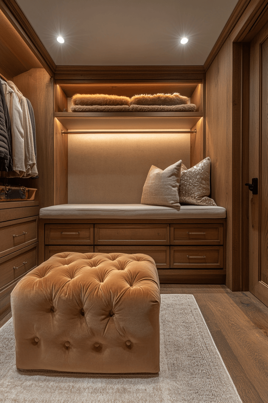 Graceful and luxurious, this dressing suite embodies alpine interior design refinement. Custom wood millwork envelops the space in warmth. Plush seating and layered lighting elevate daily rituals. Expansive mirrors enhance depth and light. The atmosphere feels polished yet organic. Transform your wardrobe area with alpine interior design sophistication now!