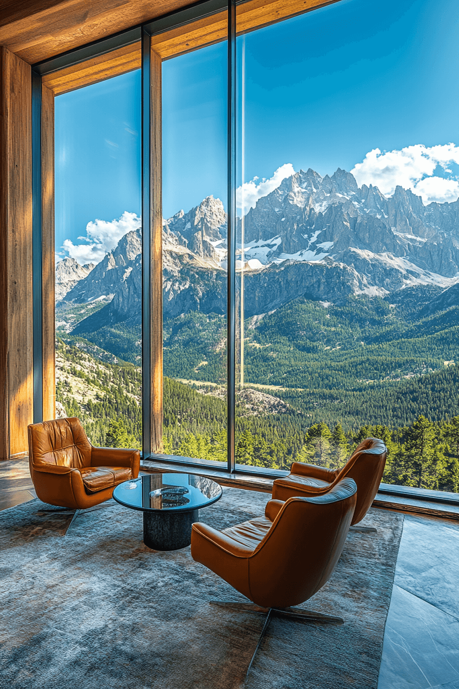 Surrounded by panoramic glass, this scenic retreat expresses alpine interior design through uninterrupted views. Natural materials subtly frame the landscape. Low-profile furnishings preserve openness and flow. Soft textiles introduce warmth without distraction. The mood feels expansive and serene. Experience alpine interior design at its most breathtaking and design your mountain-view sanctuary now!