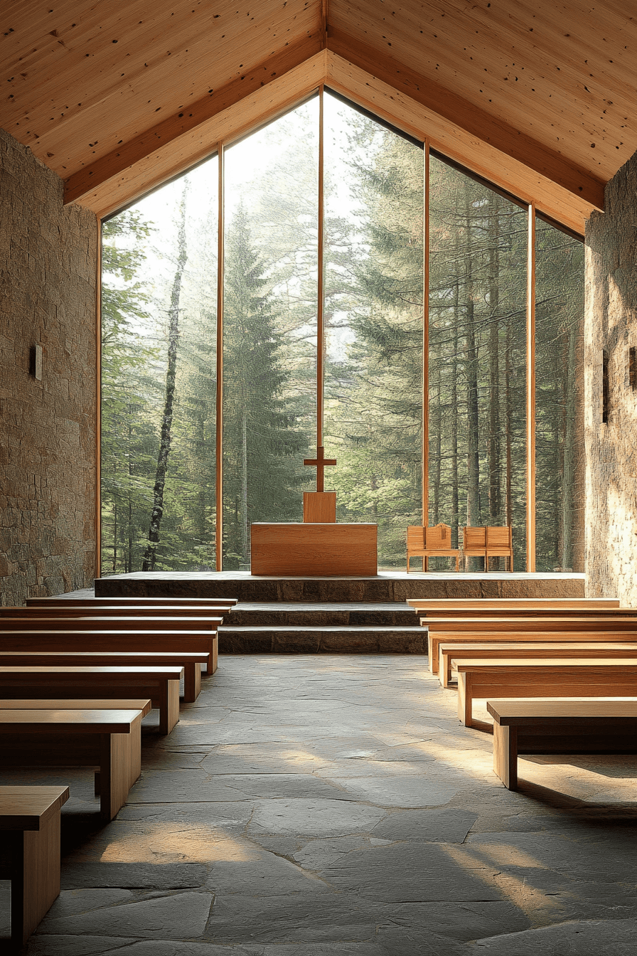 Simple and soulful, this mountain chapel reflects alpine interior design through honest craftsmanship. Hand-carved timber seating and stone accents ground the space in authenticity. Filtered light from stained glass adds gentle color. Surrounding peaks enhance reflection and reverence. The atmosphere feels peaceful and intentional. Let alpine interior design inspire your own contemplative sanctuary today!