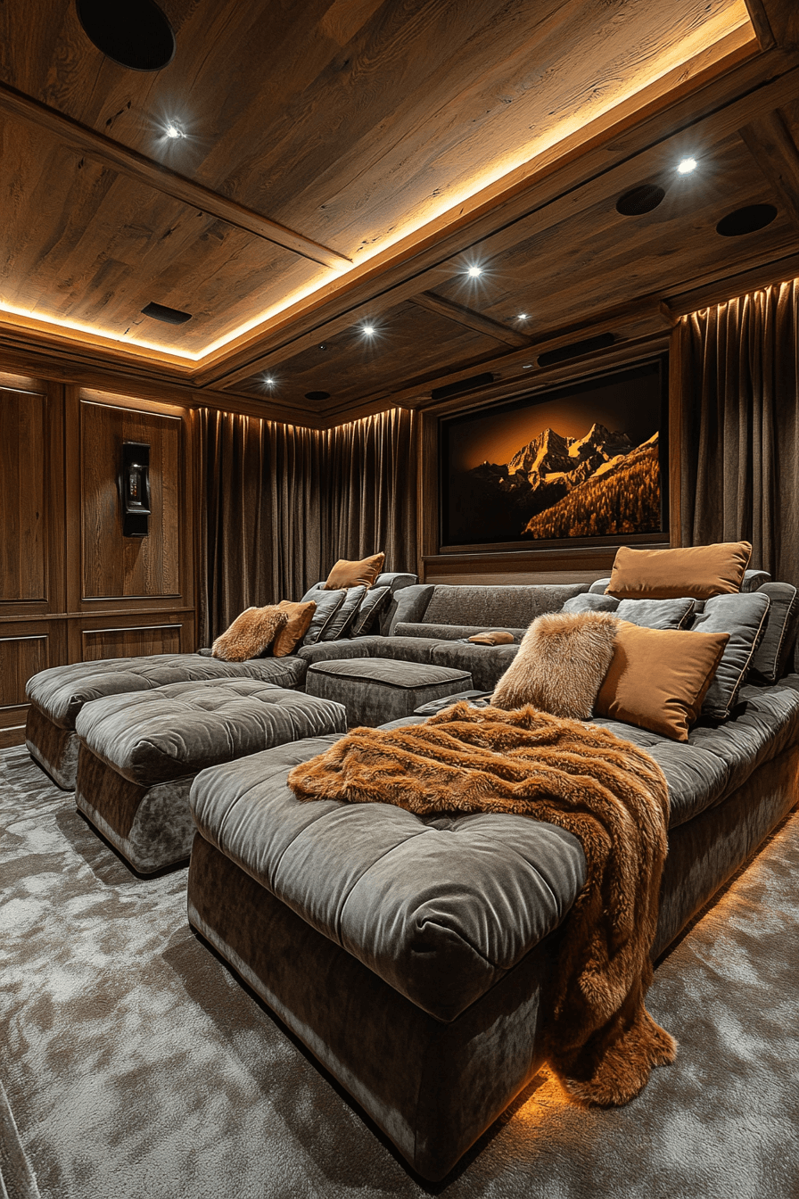This cinematic retreat transforms alpine interior design into a cozy yet elevated entertainment lounge. Deep, sink-in seating layered with tactile fabrics creates irresistible comfort. Wood-paneled walls and dimmable lighting establish an intimate atmosphere perfect for movie nights. Subtle mountain-inspired decor ties the design together seamlessly. It’s a refined take on lodge-style relaxation. Explore alpine interior design media room ideas and craft your ultimate viewing haven now!