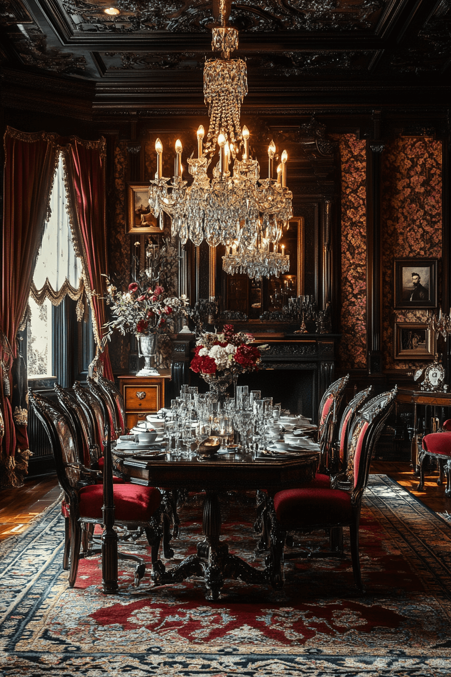 Old-world romance defines antique dining rooms inspired by Victorian grandeur. Towering buffets, intricately turned table legs, and richly upholstered chairs create a layered, immersive setting. Deep mahogany tones and patterned wallpaper heighten the dramatic mood. Ornate chandeliers scatter warm light across polished silver and fine china. The space feels ceremonial yet warmly inviting for lingering conversation. Bring Victorian-inspired antique dining rooms into your home and turn every meal into a timeless celebration today!