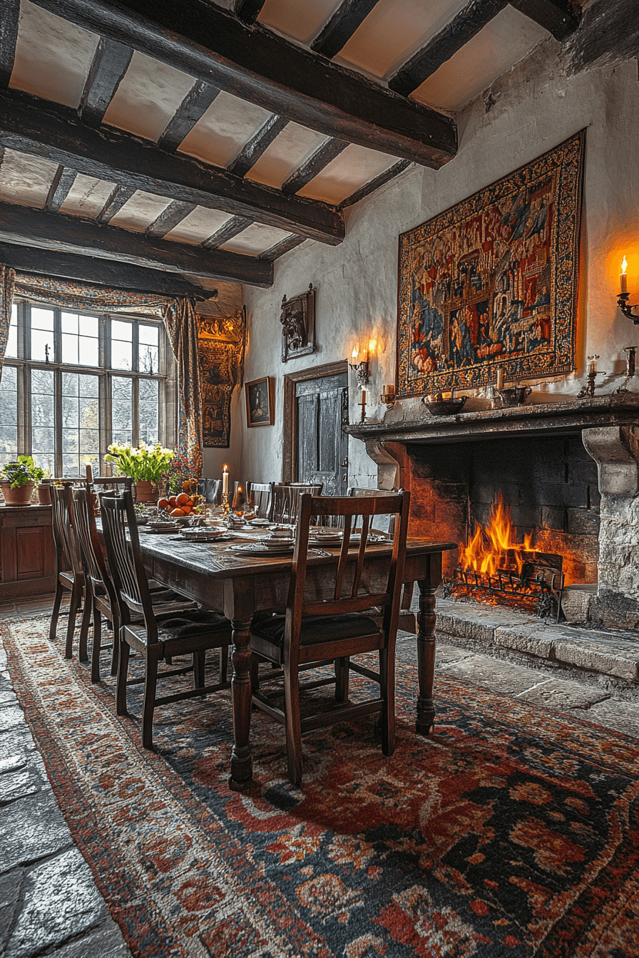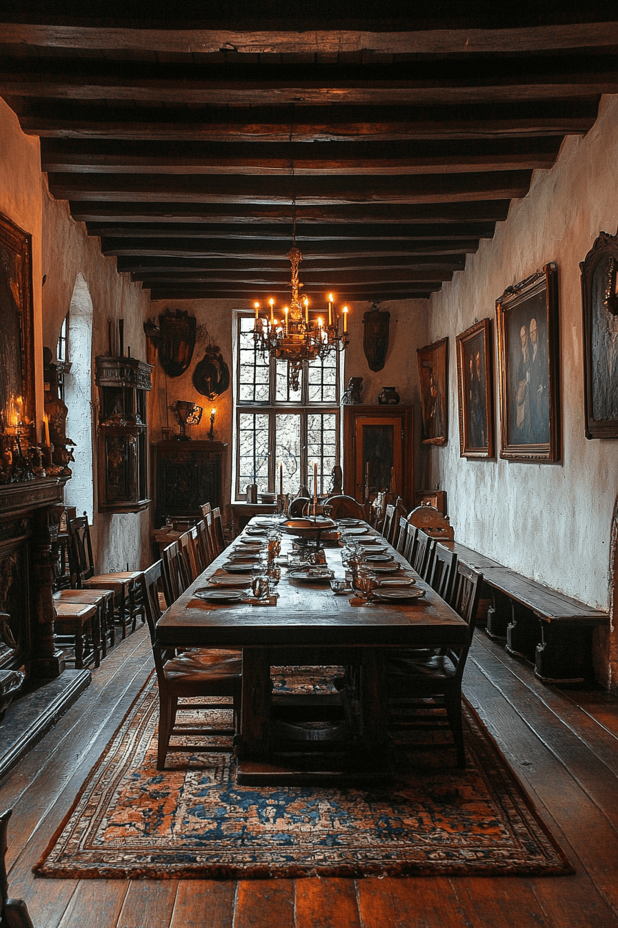 Tudor architecture strengthens antique dining rooms with dramatic structure. Heavy beams and solid oak tables anchor the space. Candlelit sconces heighten intimate ambiance. Decorative iron accents reinforce historic richness. The room feels powerful yet inviting. Host bold gatherings with Tudor antique dining rooms now!