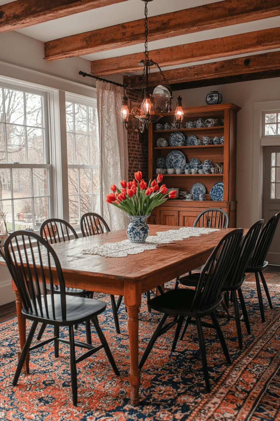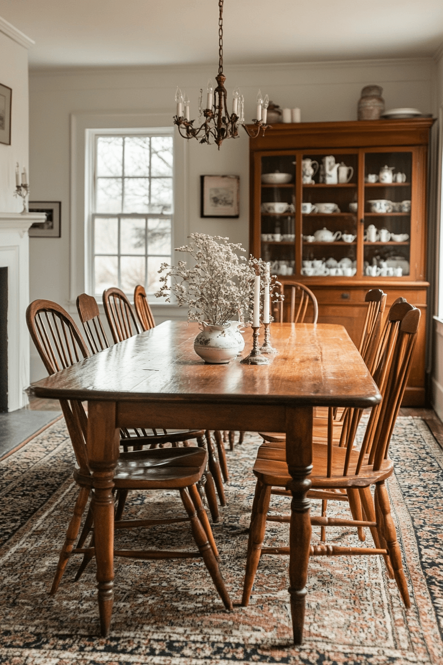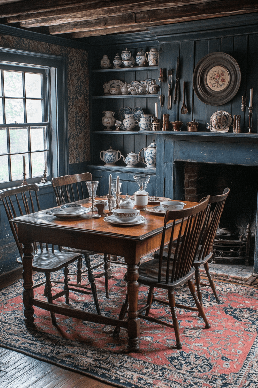 Dutch Colonial heritage warms antique dining rooms with cozy authenticity. Dark-stained wood pieces add depth and familiarity. Blue-and-white ceramics enhance traditional charm. Balanced arrangements encourage relaxed conversation. The mood feels welcoming and timeless. Gather in comfort with Dutch Colonial antique dining rooms today!