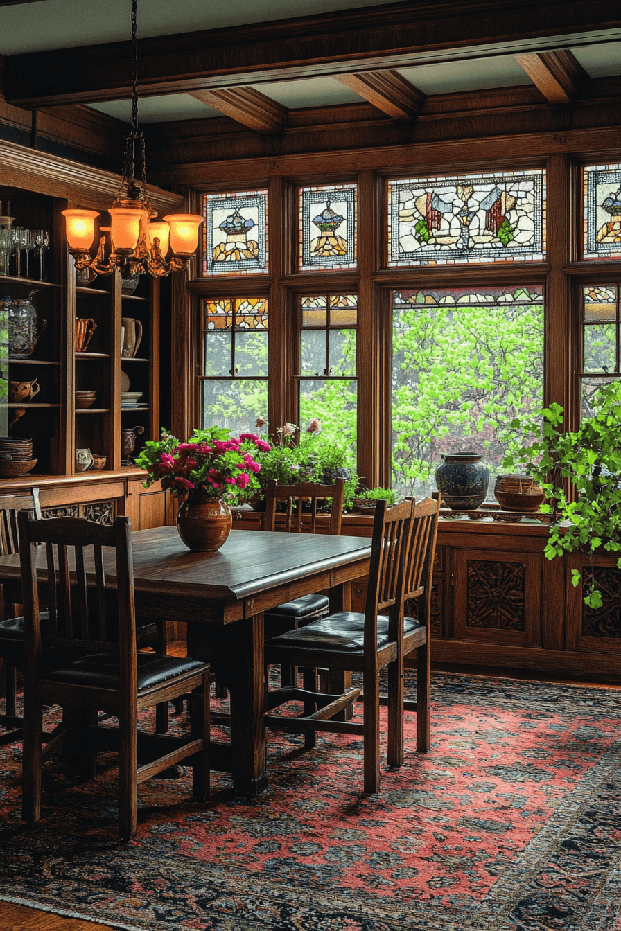 Arts and Crafts influence shapes antique dining rooms with handcrafted authenticity. Thick wood planks and exposed joinery showcase honest construction. Earthy greens and warm browns ground the palette. Stained glass lighting adds artistic depth. The result feels soulful and enduring. Embrace Arts and Crafts antique dining rooms and celebrate natural beauty today!