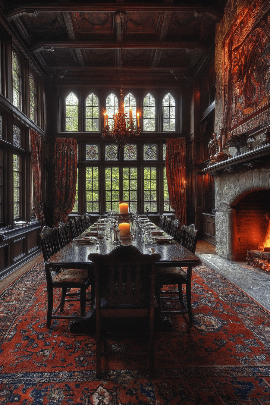 Elizabethan influence enriches antique dining rooms with bold artistry and ceremonial flair. Substantial carved furniture and dramatic tapestries create visual depth. Deep hues envelop the space in warmth and richness. Ornate candelabras heighten historic ambiance. The room feels stately yet welcoming. Experience Elizabethan antique dining rooms and host with noble presence today!