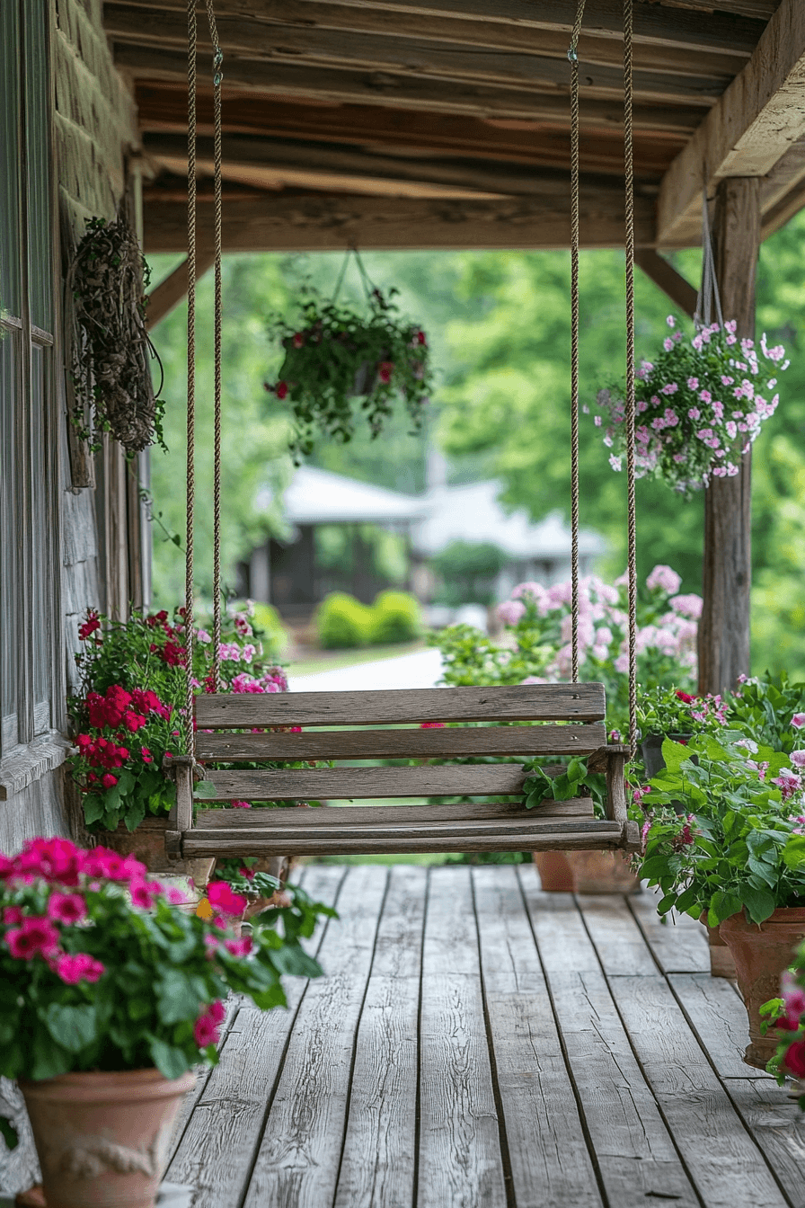 Enjoy slow mornings and golden sunsets on a porch designed with antique farmhouse decor ideas. A swinging bench, faded pillows, and chipped paint exude effortless charm. The soft breeze feels even sweeter in a space this peaceful. Every creak tells a story of comfort.
