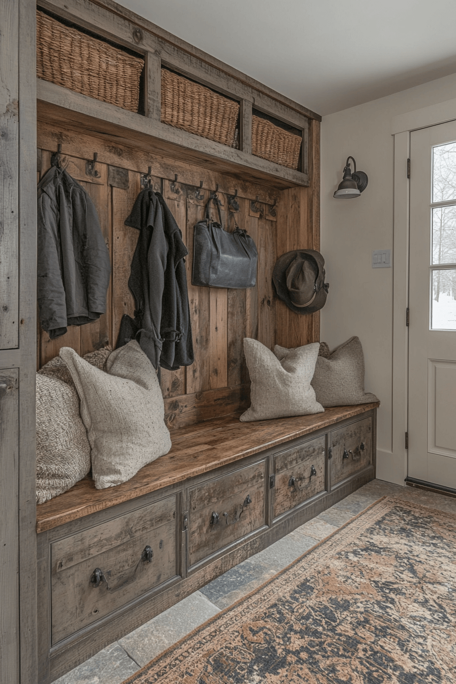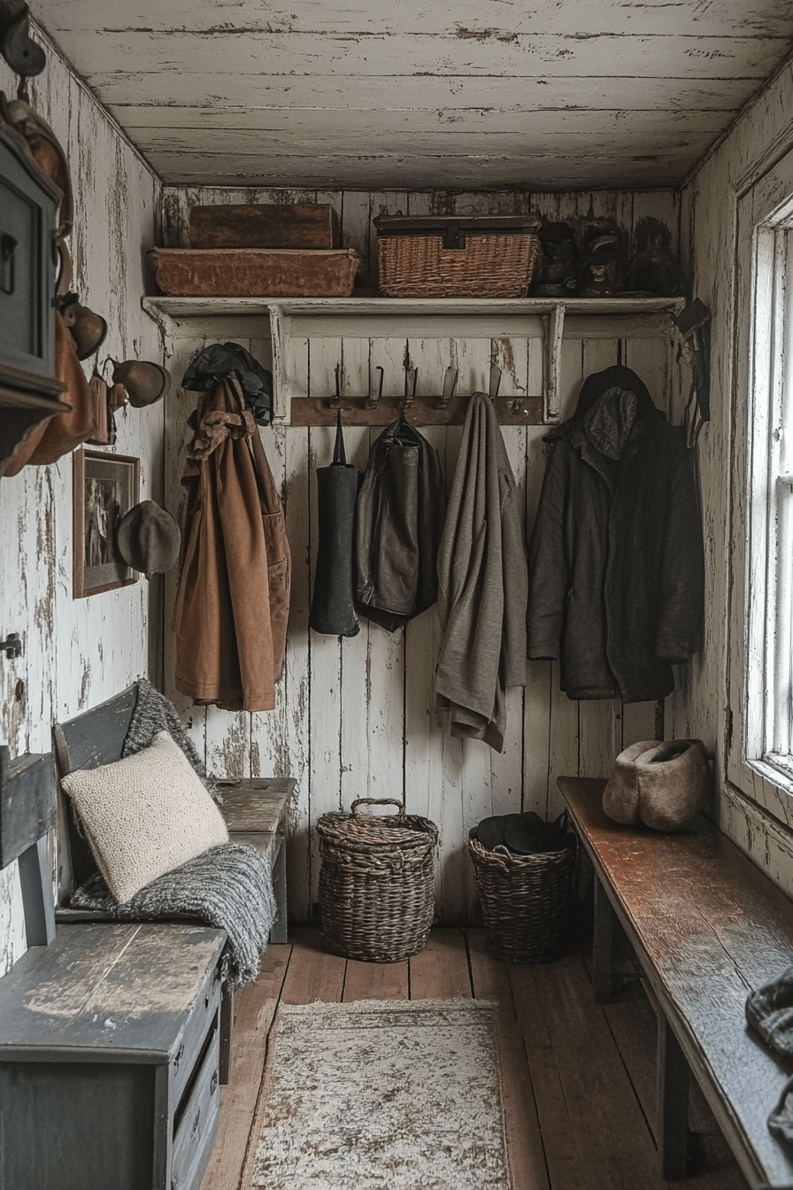 Make every entrance feel intentional with antique farmhouse decor ideas that elevate your boot room. Wooden benches, woven baskets, and aged hooks blend utility with character. Every detail feels charming and functional. It’s an everyday space made beautiful through simplicity.