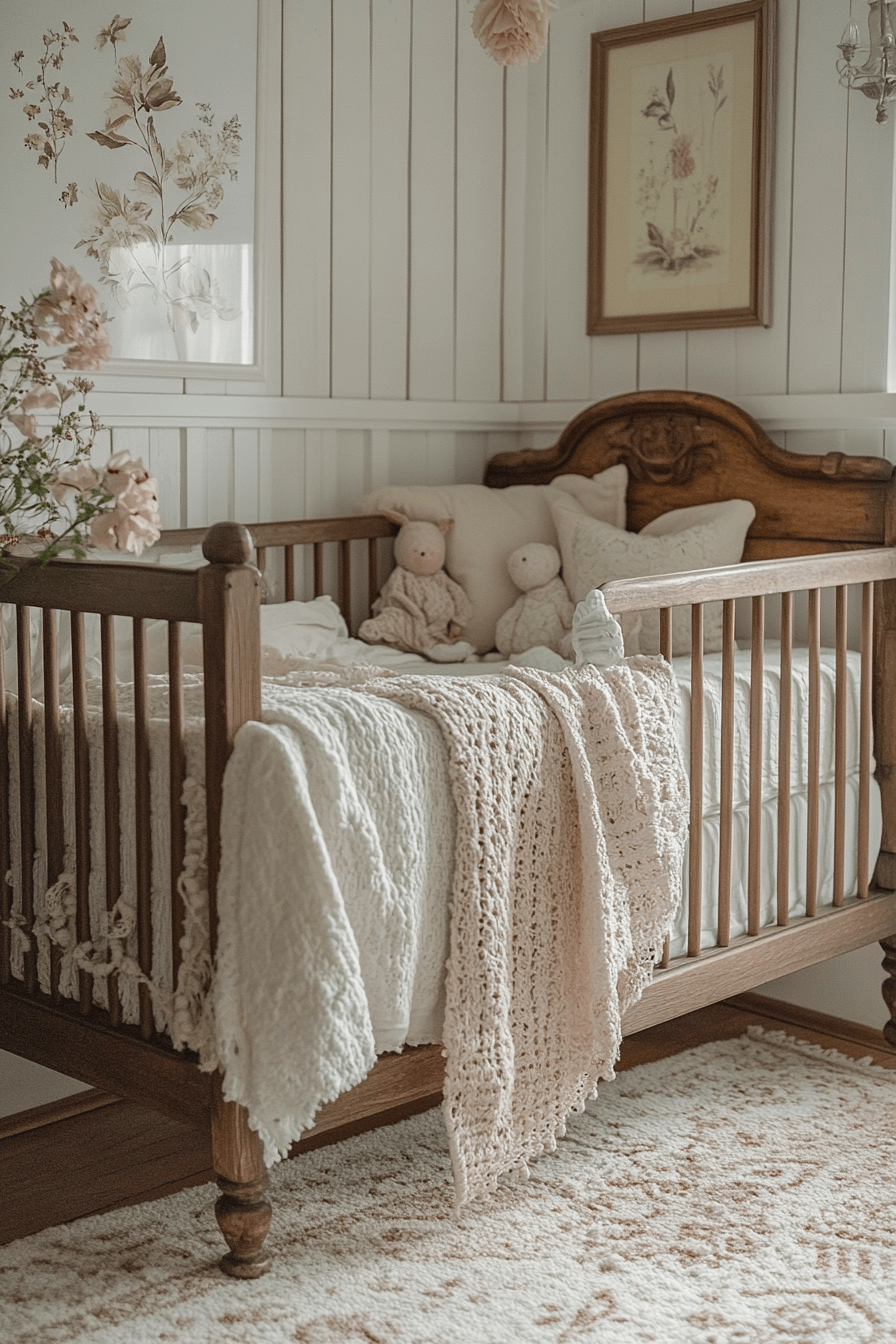 Add tenderness and nostalgia to your baby’s room with antique farmhouse decor ideas. Wooden cribs, rocking chairs, and lace accents create a soothing sanctuary. The soft tones and natural textures bring a feeling of calm and connection. Every piece radiates love and legacy.
