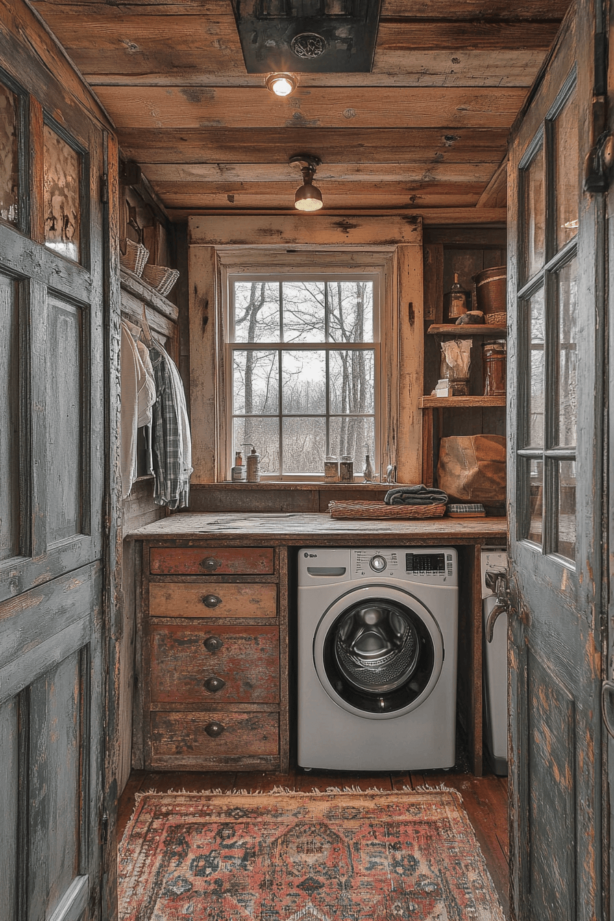 Infuse beauty into the everyday with antique farmhouse decor ideas for your laundry room. Weathered shelving, woven baskets, and soft fabrics make chores feel lighter. The muted palette adds warmth and ease. It’s a small space that delivers big charm.