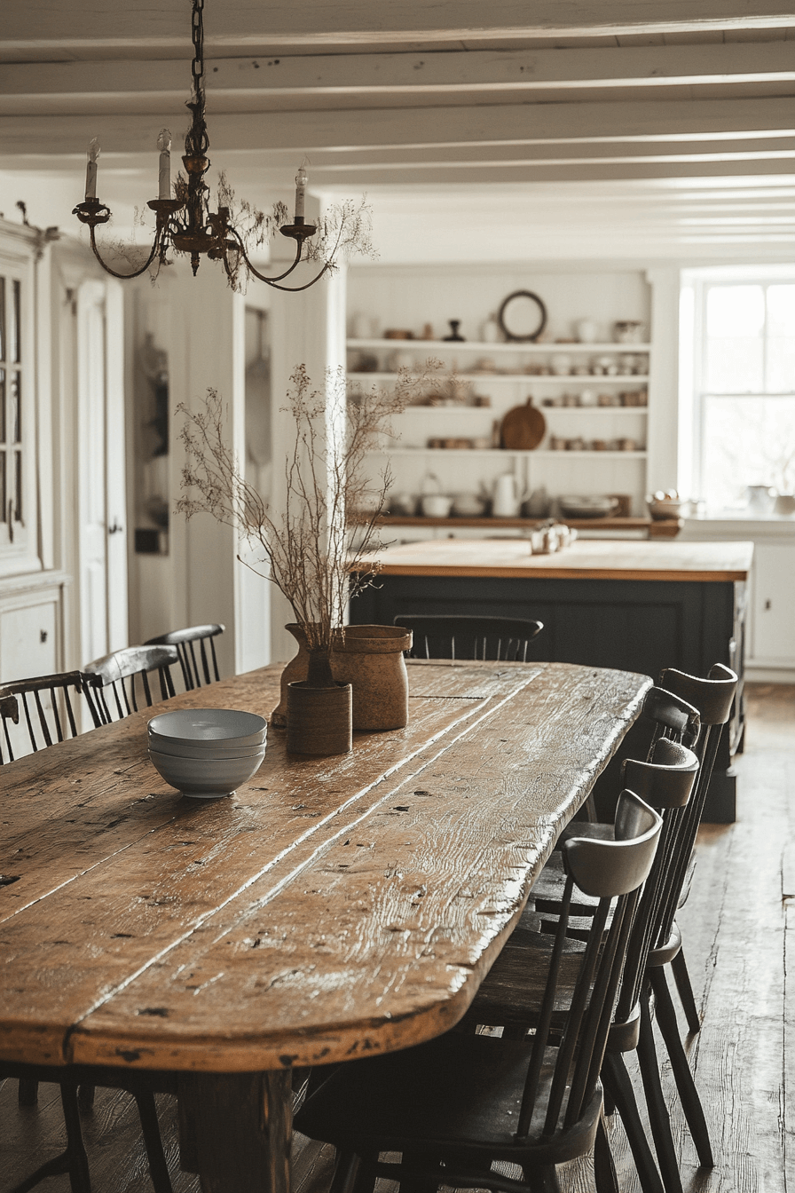 Bring people together with antique farmhouse decor ideas that make your dining table the heart of the home. Aged wood, soft lighting, and mismatched chairs set a comforting tone for conversation. Every scratch tells a story of shared laughter and tradition. The beauty lies in its imperfection and authenticity.