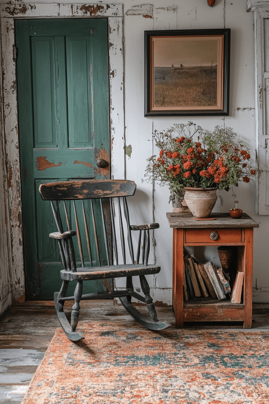 Make your home’s first impression unforgettable with antique farmhouse decor ideas for the entryway. An aged brass knocker and weathered wood door frame set a timeless tone. The details speak of pride and craftsmanship. It’s a warm invitation before anyone steps inside.