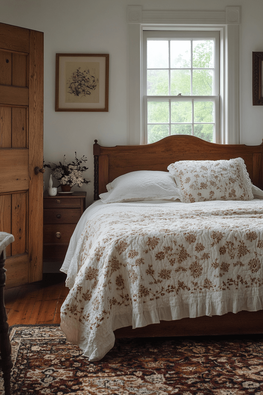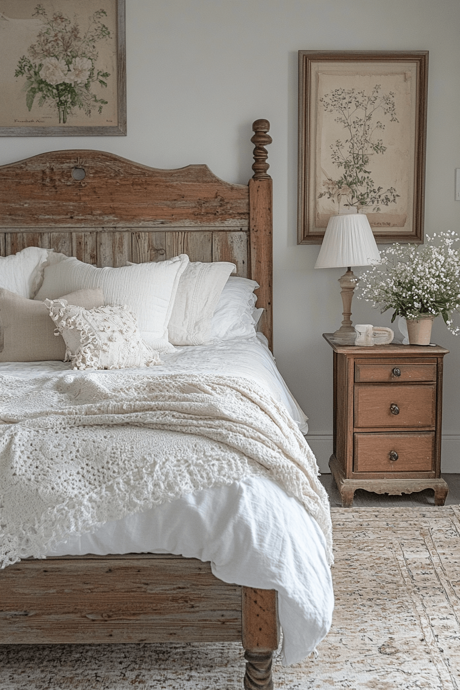 Create a dreamy bedroom that feels like stepping into another time with antique farmhouse decor ideas. A distressed bed frame, embroidered linens, and a weathered dresser bring peace and storybook charm. Natural wood tones blend beautifully with cozy textiles. It’s elegance infused with heart and memory.