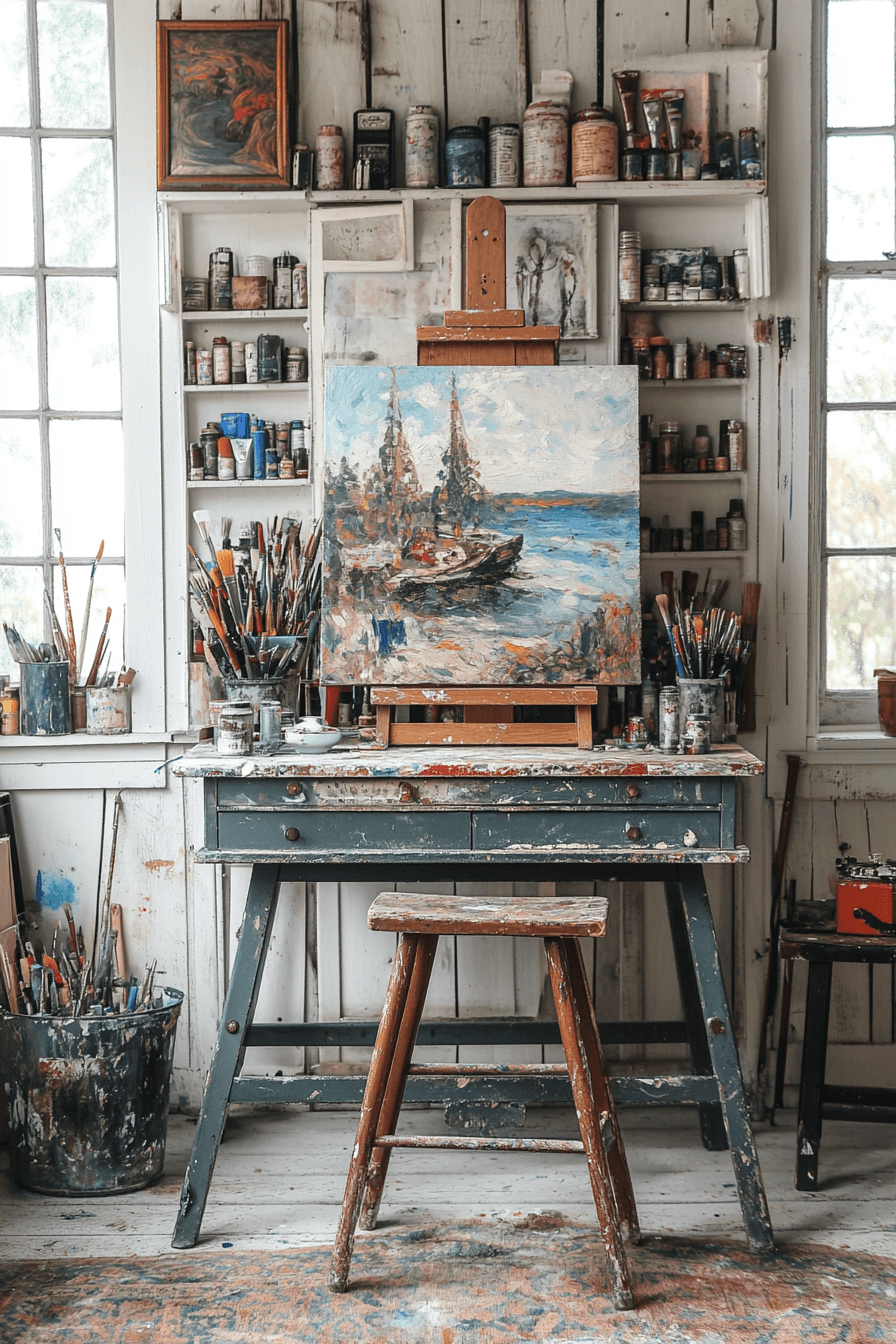 Turn your art studio into a soulful retreat using antique farmhouse decor ideas that inspire creativity. Wooden easels, vintage jars, and distressed tables make it feel both functional and magical. The imperfections add personality and focus. Every stroke feels more inspired.