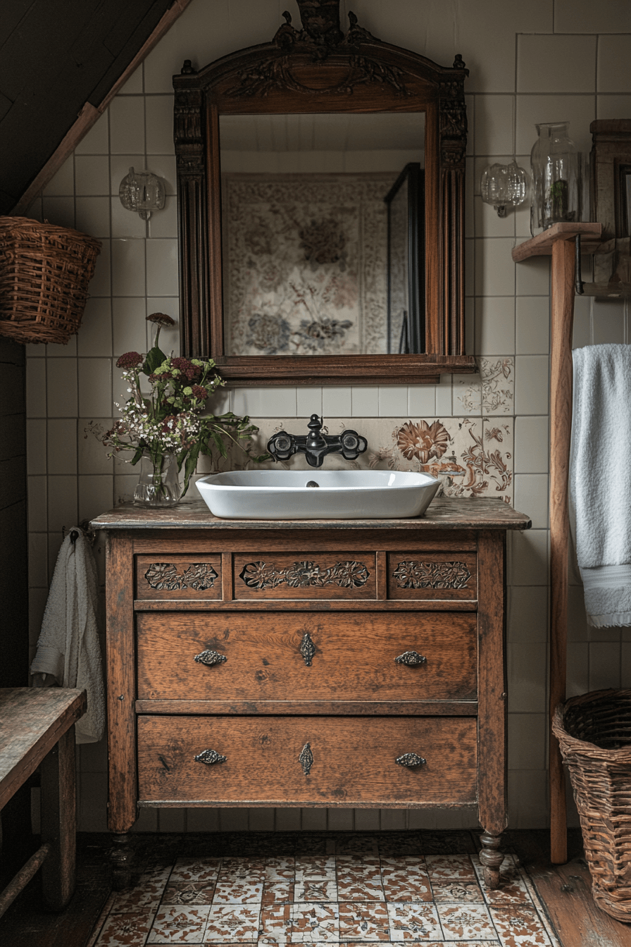 Begin every morning surrounded by beauty with antique farmhouse decor ideas that spotlight vintage vanities. Curved mirrors and ornate carvings add elegance without excess. The faded paint brings character that modern pieces can’t replicate. Every glance feels softer, more sentimental.
