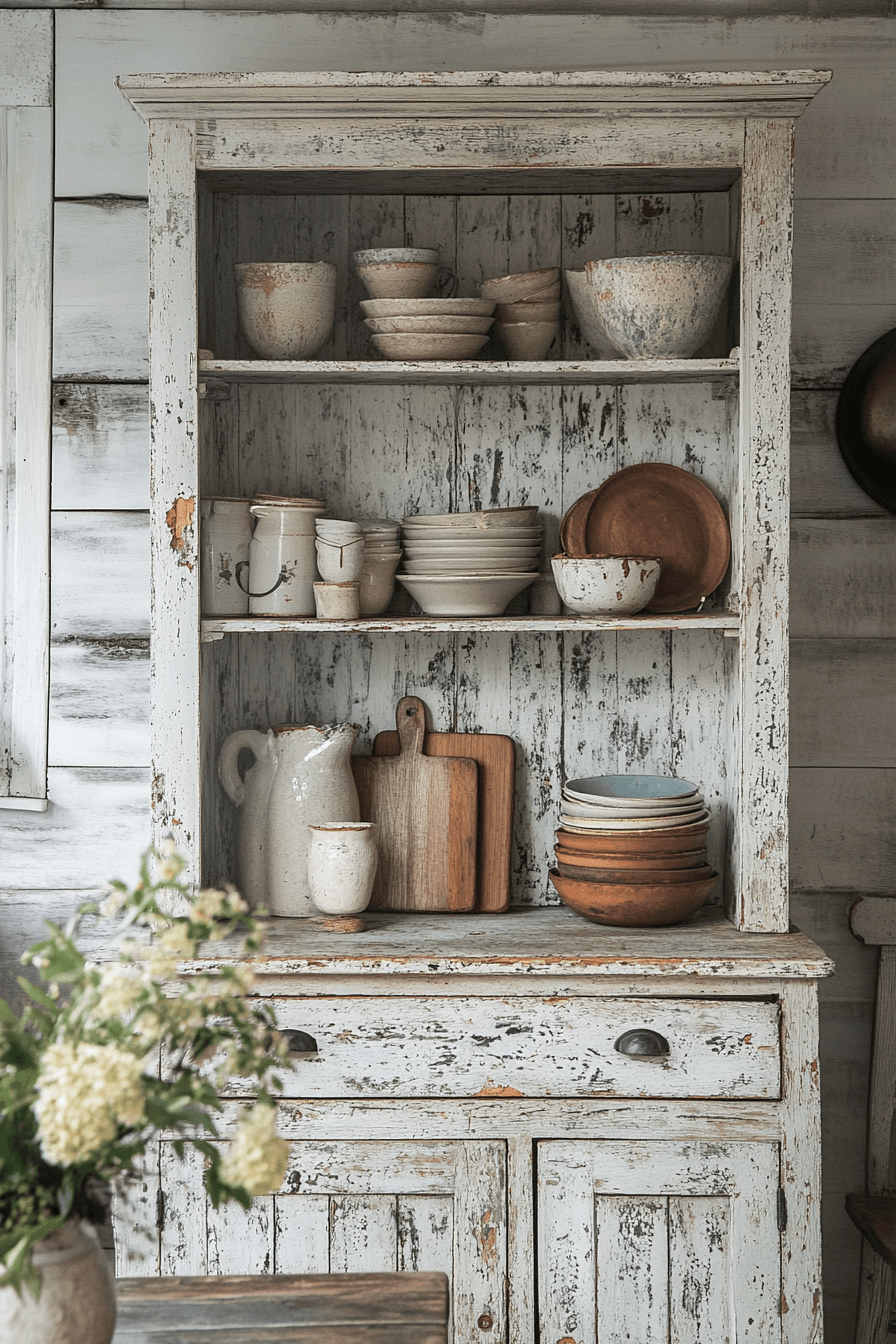 Celebrate rustic living with antique farmhouse decor ideas that make your kitchen radiate warmth. Chipped cabinets, antique hardware, and open shelves create a space that feels loved and lived in. The imperfections add depth and soul. Every meal cooked here carries a touch of nostalgia.