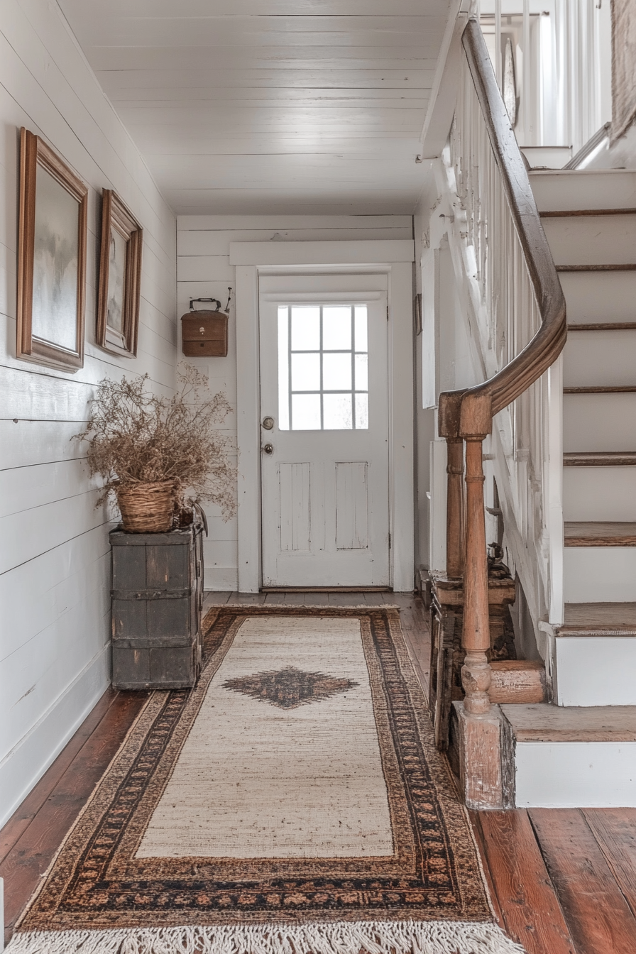 Add warmth beneath your feet with antique farmhouse decor ideas centered around vintage hallway runners. Muted colors and faded patterns tie each room together with harmony. The woven textures feel cozy and elegant. Each thread carries quiet nostalgia.