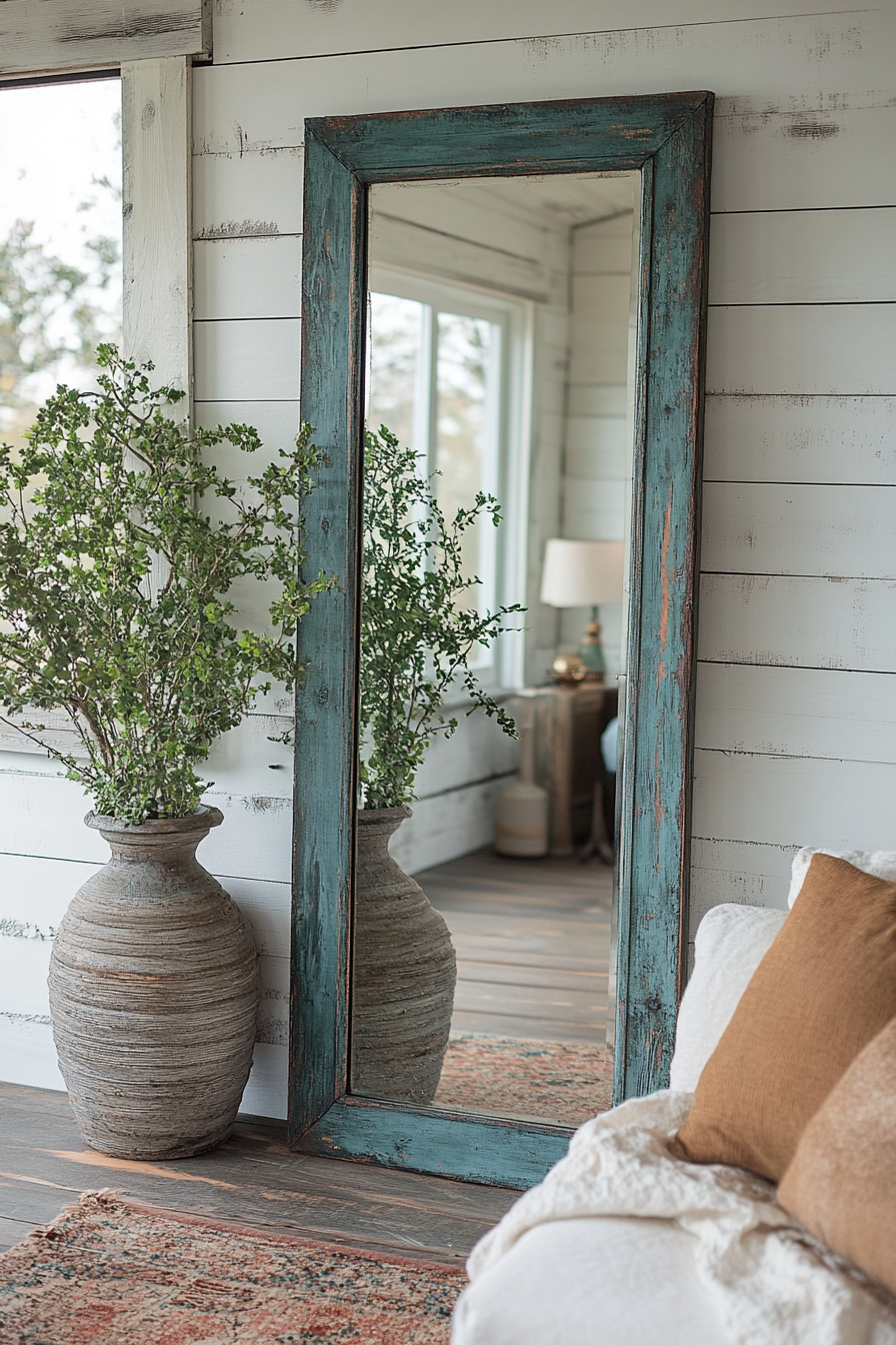 Brighten your home with the timeless reflection of antique farmhouse decor ideas using distressed mirrors. The aged frame and soft patina bring warmth to any wall. Natural light dances beautifully through the imperfect glass. It’s a small touch with a big presence.