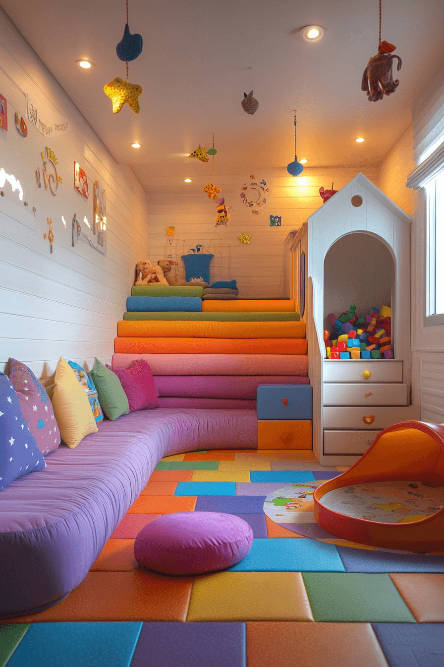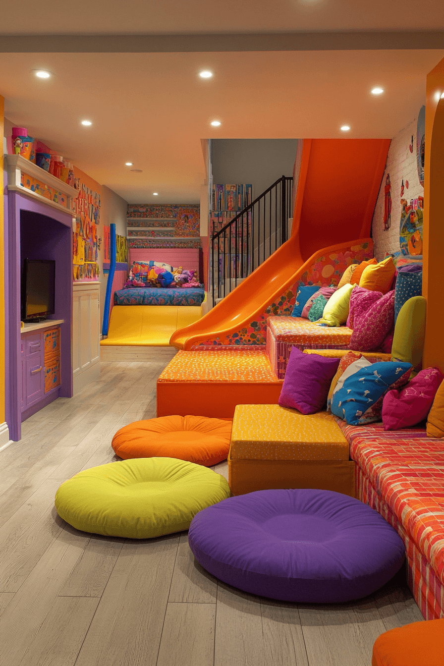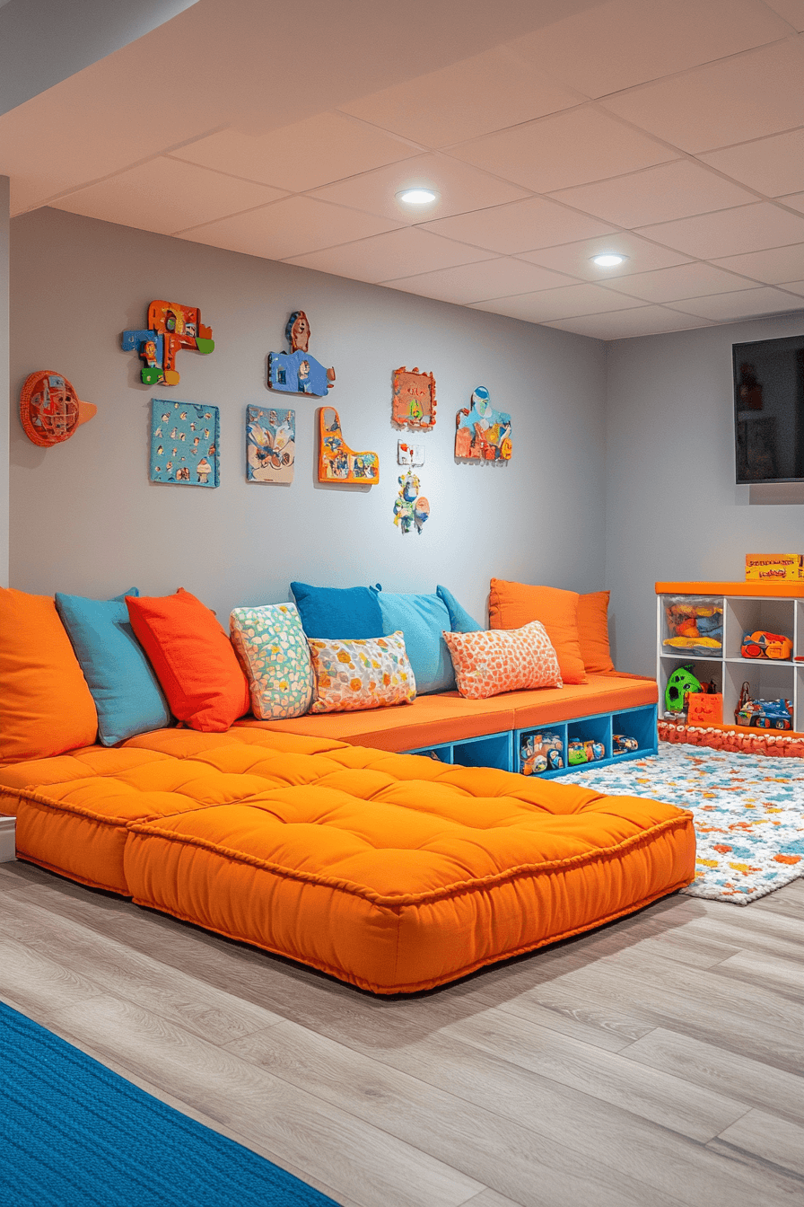 Design a colorful wonderland with basement family room ideas crafted for young kids. Soft flooring and vibrant accents inspire imagination safely. Smart storage solutions keep toys organized. The layout balances fun with function seamlessly. These basement family room ideas create a joyful, secure environment. Turn your basement into a playful paradise and let laughter fill the room.