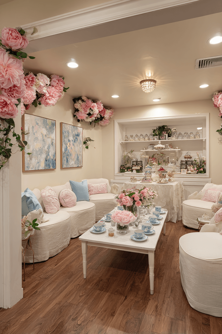 Bring elegance downstairs with basement family room ideas inspired by refined tea lounges. Plush seating and delicate details create an intimate atmosphere. Soft lighting enhances warmth and charm. The layout encourages meaningful conversation. These basement family room ideas offer sophistication in a relaxed way. Craft your cozy tea retreat and savor every gathering.