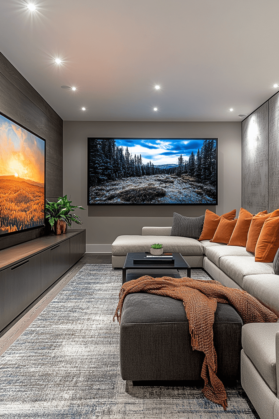 Upgrade your entertainment game with basement family room ideas built around a cutting-edge media wall. Clean-lined furniture and concealed tech keep everything sleek and clutter-free. A large screen paired with immersive sound makes every movie night feel epic. Subtle décor keeps the focus on the experience without overwhelming the design. These basement family room ideas are perfect for modern households who love high-quality entertainment. Give your basement a cinematic refresh and elevate every viewing experience.