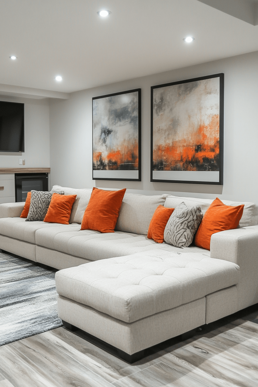 Turn your basement into the ultimate social scene with basement family room ideas designed for entertaining. A statement sectional, bold art, and a sleek beverage station instantly energize the space. Rich tones and layered lighting create a moody, inviting ambiance. The layout encourages conversation and celebration. These basement family room ideas convert overlooked areas into vibrant hosting hubs. Plan your stylish entertainment lounge and impress every guest.
