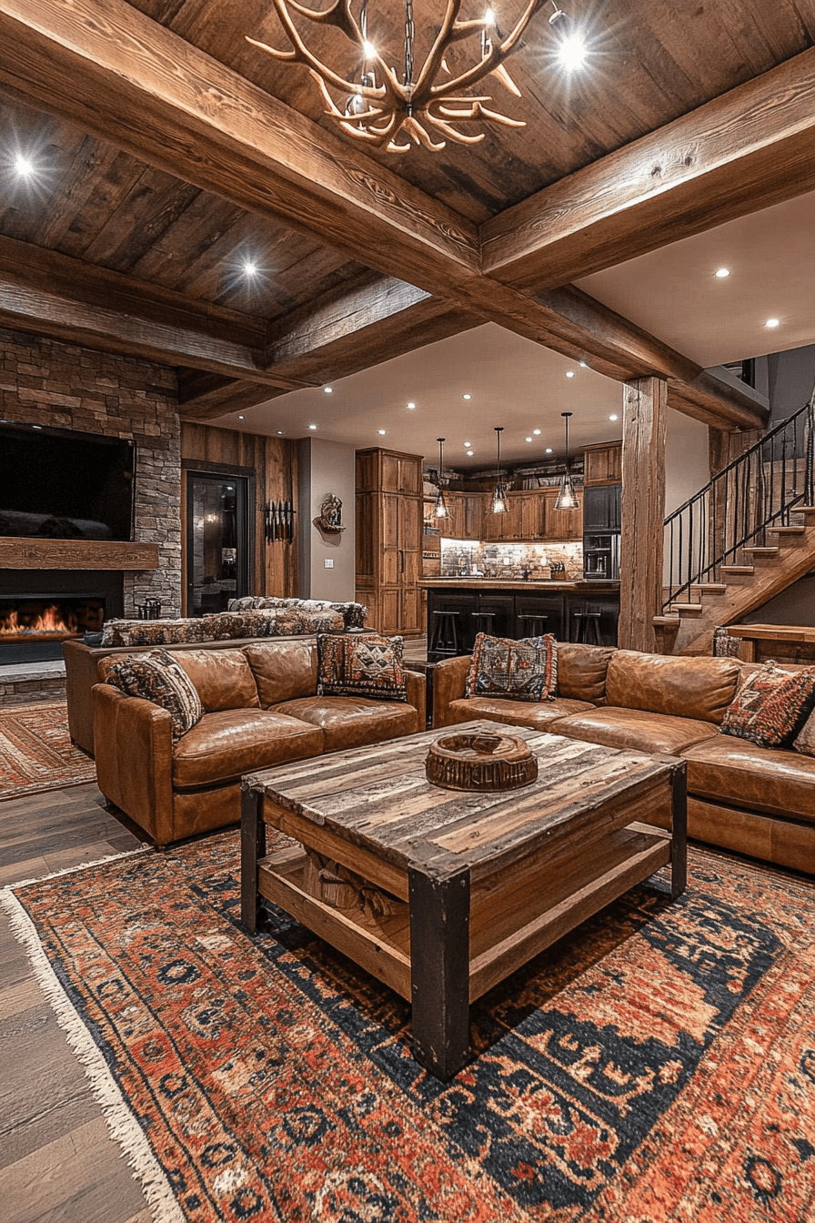 Add rustic richness to your home with basement family room ideas inspired by cozy cabin charm. Natural woods, stone textures, and warm color palettes create depth and character. Leather seating and layered lighting balance rugged appeal with comfort. The space feels grounded, welcoming, and effortlessly stylish. These basement family room ideas turn your lower level into a peaceful hideaway. Embrace rustic inspiration and craft your dream downstairs sanctuary.