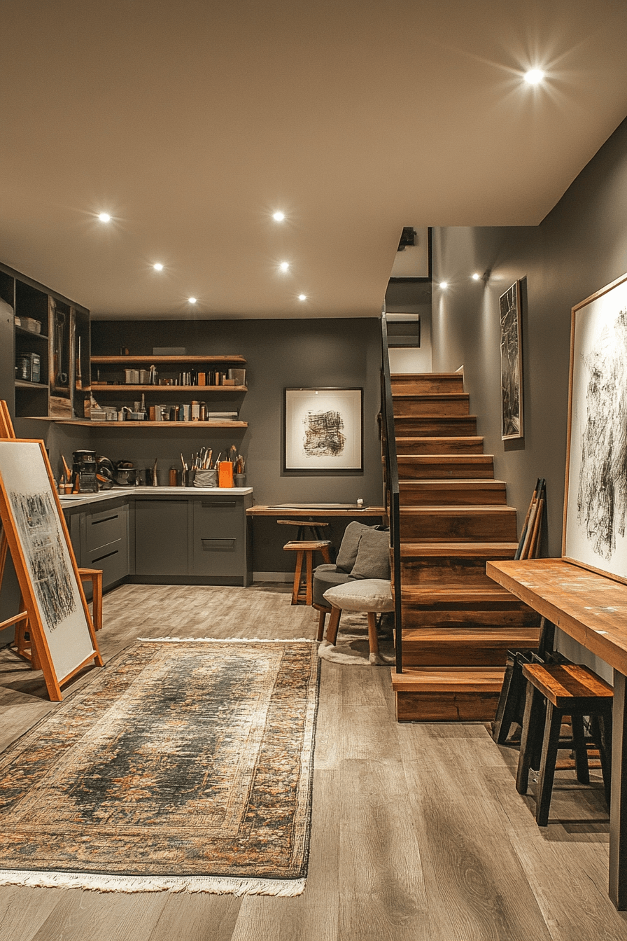 Encourage imagination with basement family room ideas built around creativity and hands-on fun. Bright lighting and easy-clean surfaces make crafting enjoyable. Organized storage keeps projects manageable and inspiring. Dedicated zones encourage artistic exploration without chaos. These basement family room ideas nurture creativity while staying practical. Create a space where ideas flow freely and inspiration thrives.
