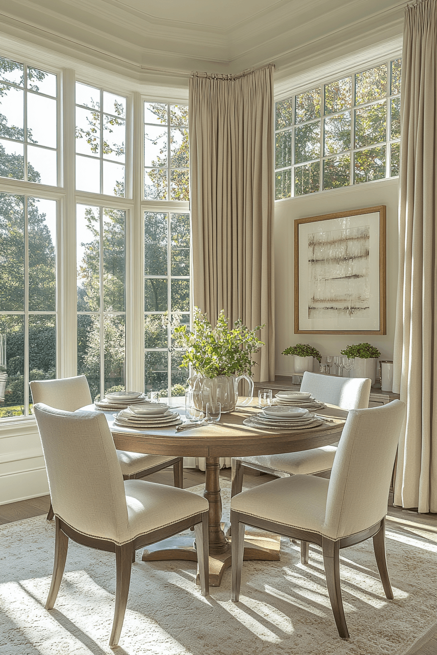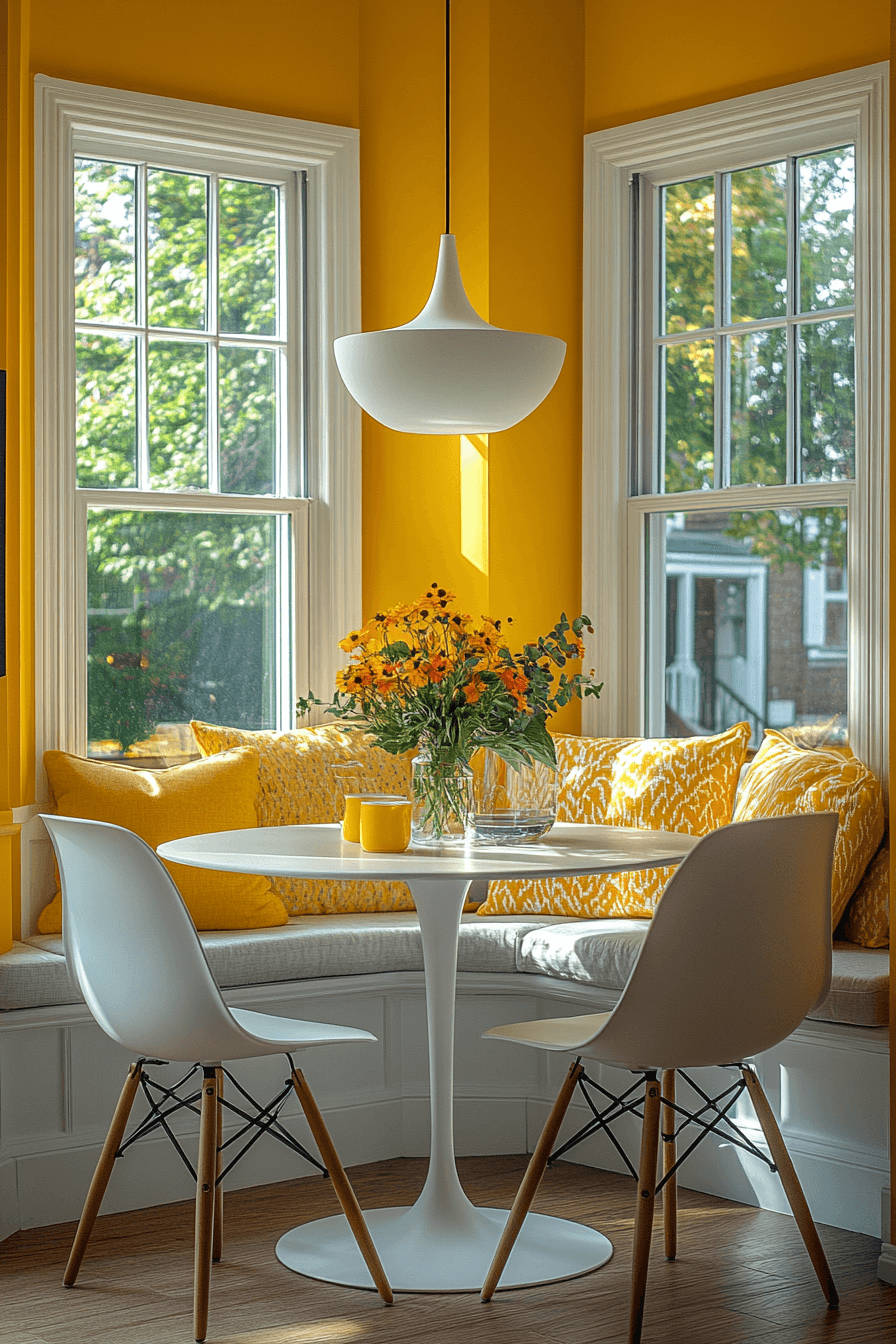 Golden morning light can make sunny breakfast nook ideas feel extra cheerful and welcoming from the very first cup of coffee. A bright corner with generous windows instantly feels more uplifting and open, especially when the table and seating are scaled to fit comfortably. Light curtains help soften the sunlight while still keeping the room glowing. Small pops of yellow or citrus-inspired decor add even more energy without taking over the design. The finished nook feels happy, fresh, and wonderfully easy to enjoy. Explore more breakfast nook ideas that make every morning feel brighter and more beautiful!