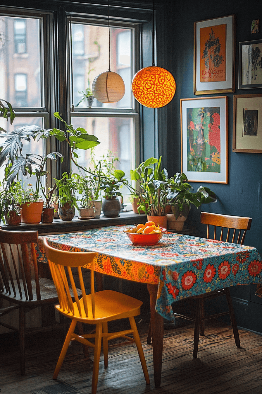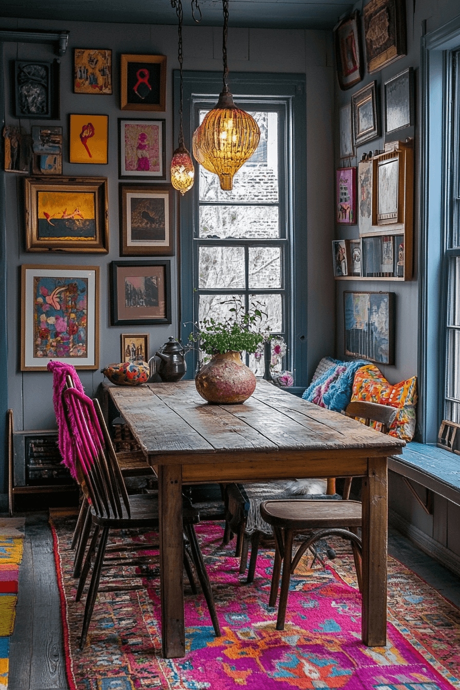 Art-filled walls can make inspiring breakfast nook ideas feel more personal and creative. Gallery-style pieces add color, movement, and visual interest while simple furniture keeps the layout from feeling too busy. Daylight enhances the artwork and makes the whole nook feel more vibrant. The area starts to feel like a small creative escape instead of just a place to eat. The final atmosphere is expressive, curated, and full of life. Discover more breakfast nook ideas designed for art lovers and creative homes!