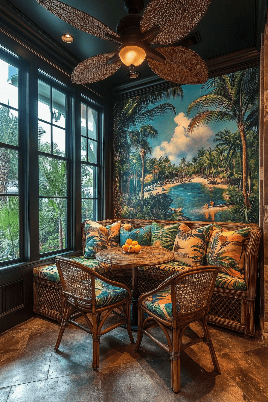 Tropical elements can make lively breakfast nook ideas feel bright, sunny, and full of fun. Wicker chairs, bamboo-inspired finishes, and playful patterned fabrics help create a cheerful getaway feel inside your own home. A few green plants or leafy accents can reinforce the mood in a subtle way. The palette feels light and energetic while the layout stays easy and practical. The result is fresh, vibrant, and wonderfully uplifting. Discover more breakfast nook ideas that bring tropical warmth to your mornings!